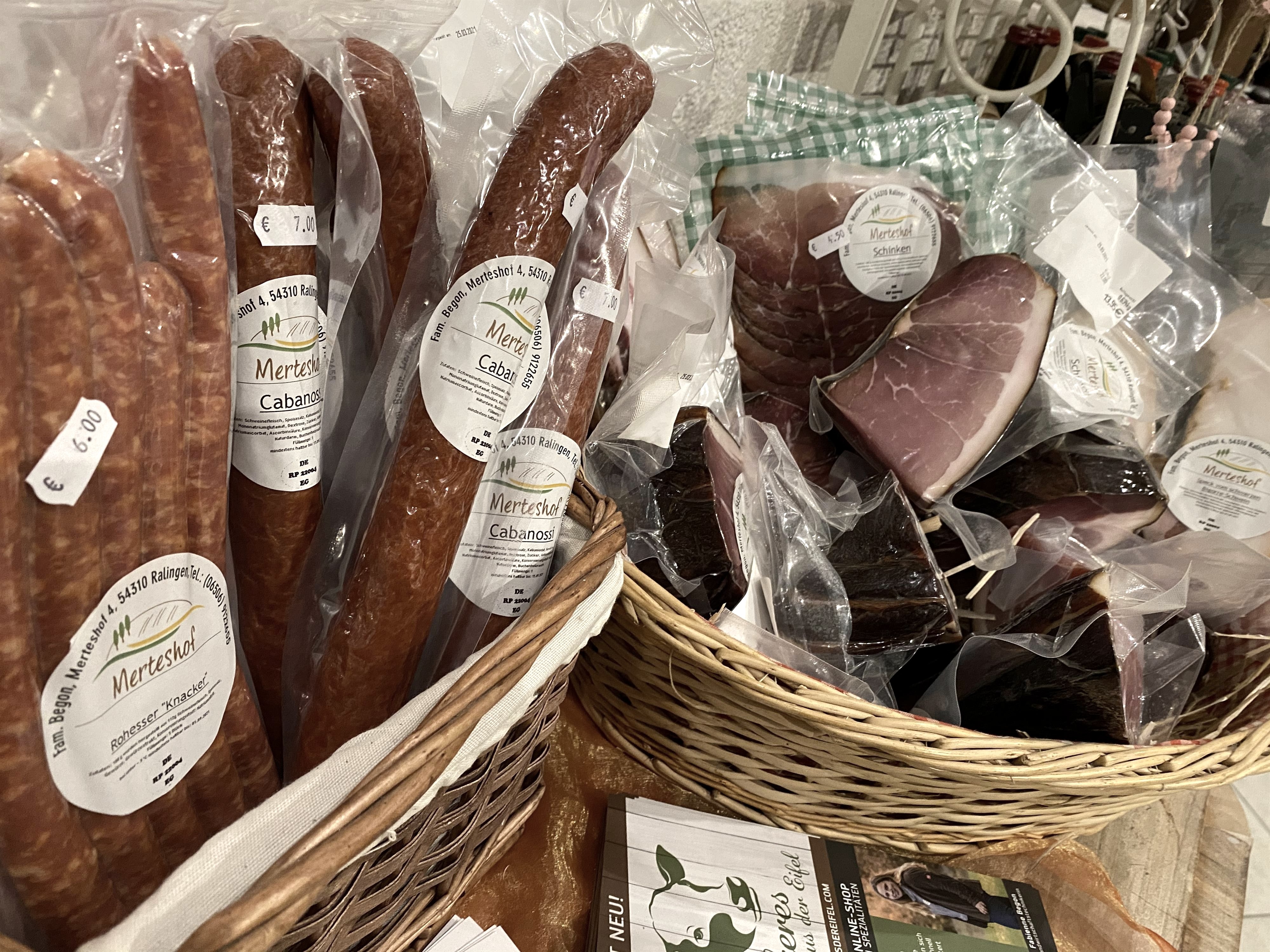 Hofladen mit verschiedenen Wildprodukte, Wildgrillgut, Eier, Nudeln, (verschied. Sorten), Kartoffeln, Apfelsaft, verschiedene Honigsorten, Salami, Schinken, Käsegriller, Bratwurst, Schwenkbraten (saisonbedingt), Wurstgläser (verschied. Sorten), Konfitüre/Gelee (versch. Sorten) div. Deko- und Antikartikel, verschiedene Alpaka-Seifen diverse Gin´s, Schnäpse, Liköre und vieles mehr.