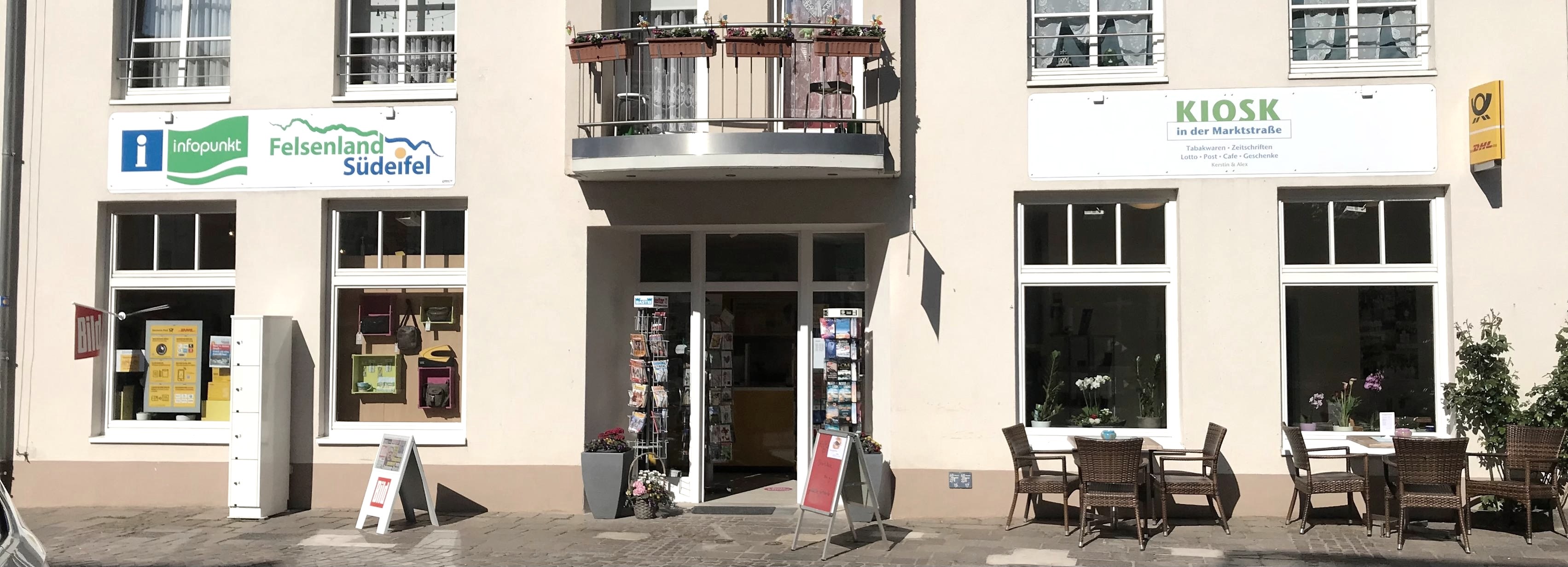 Die Ladestation steht direkt am Eingang zum Tourist Infopunkt bzw. Kiosk am Markt in Neuerburg.