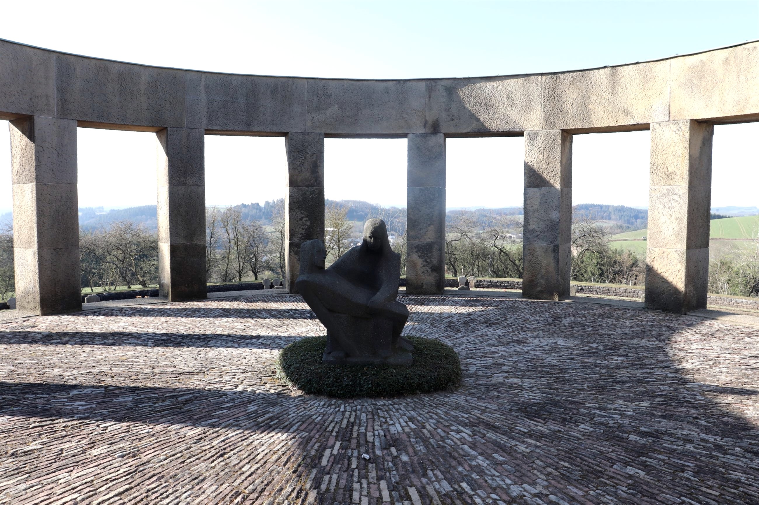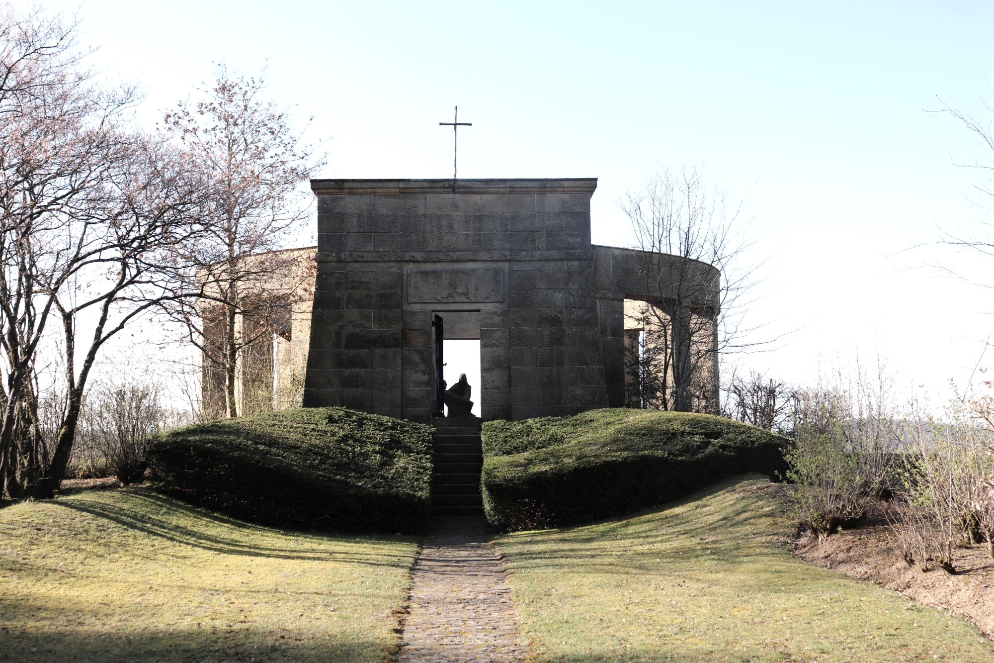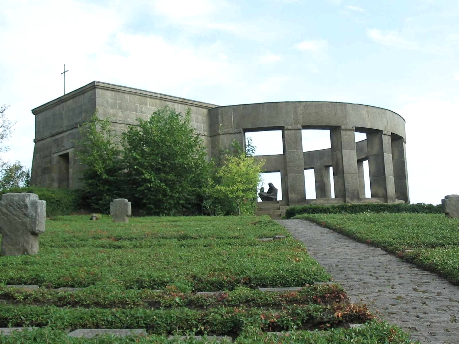 Die Kriegsgräberstätte in Daleiden ist mit über 3000 im Zweiten Weltkrieg Gefallenen der größte Ehrenfriedhof in Rheinland-Pfalz. Die Gefallenen waren bis zur Umbettung nach Daleiden auf 72 kleineren Anlagen der näheren Umgebung bestattet. lm natürlichen Abfall des Hangs sind die Gräberreihen im Verlauf der Höhenschichten eingeordnet, erschlossen durch Umgangs- und Zugangswege zu den einzelnen, mit einem Namensstein versehenen Gräbern. Eine Stützmauer mit Wall schließt die Gräberfläche nach außen ab. Kreuzwegstationen führen zur Friedhofsanlage. Der Ehrenfriedhof wurde - anstelle einer kleinen, barocken Wegekapelle - auf einer Anhöhe östlich des Ortes in den Jahren 1954 - 59 zum Gedenken an die im Eifel-Ardennen-Raum gefallenen Soldaten des 2.Weltkriegs angelegt. Die in mehreren ringförmigen Reihen angelegten Gräber von 3 224 Soldaten laufen auf einen offenen Gedenkraum im Zentrum des Rings zu. Die Gedenkstätte selbst wurde als Pfeilerrotunde gestaltet, in deren Mitte sich eine steinerne Pietà in expressiven Formen befindet. Eine Gedenkhalle mit den Namen der Gefallenen schließt an die Rotunde an.