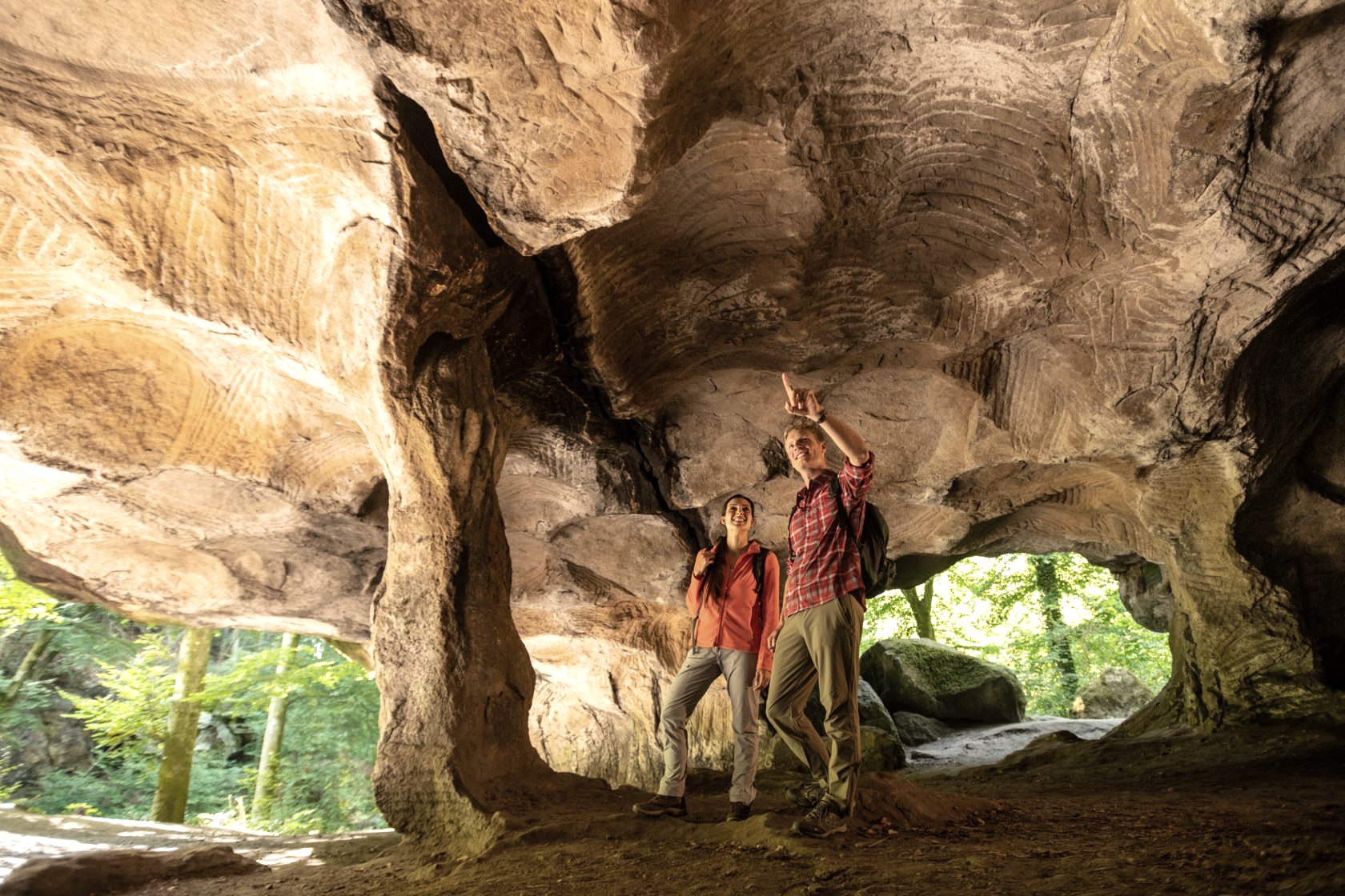 Die Wanderroute Felsenweg 1 im NaturWanderPark delux in der Südeifel startet in der ältesten Stadt Luxemburgs, in Echternach. Weithin schallen die neun Glocken aus den hoch aufragenden Türmen der Basilika, Stolz der ehemaligen Reichsabtei. Unter den strengen Blicken der herrschaftlich herausgeputzten Figuren an der Fassade des Denzelt – einst Versammlungsort, Gericht, Gefängnis und Folterkammer – geht es über den mittelalterlich anmutenden Marktplatz, dann durch eine Gasse mit zahlreichen Cafés bis zum Ortsrand, wo ein Pfad steil bergauf führt.