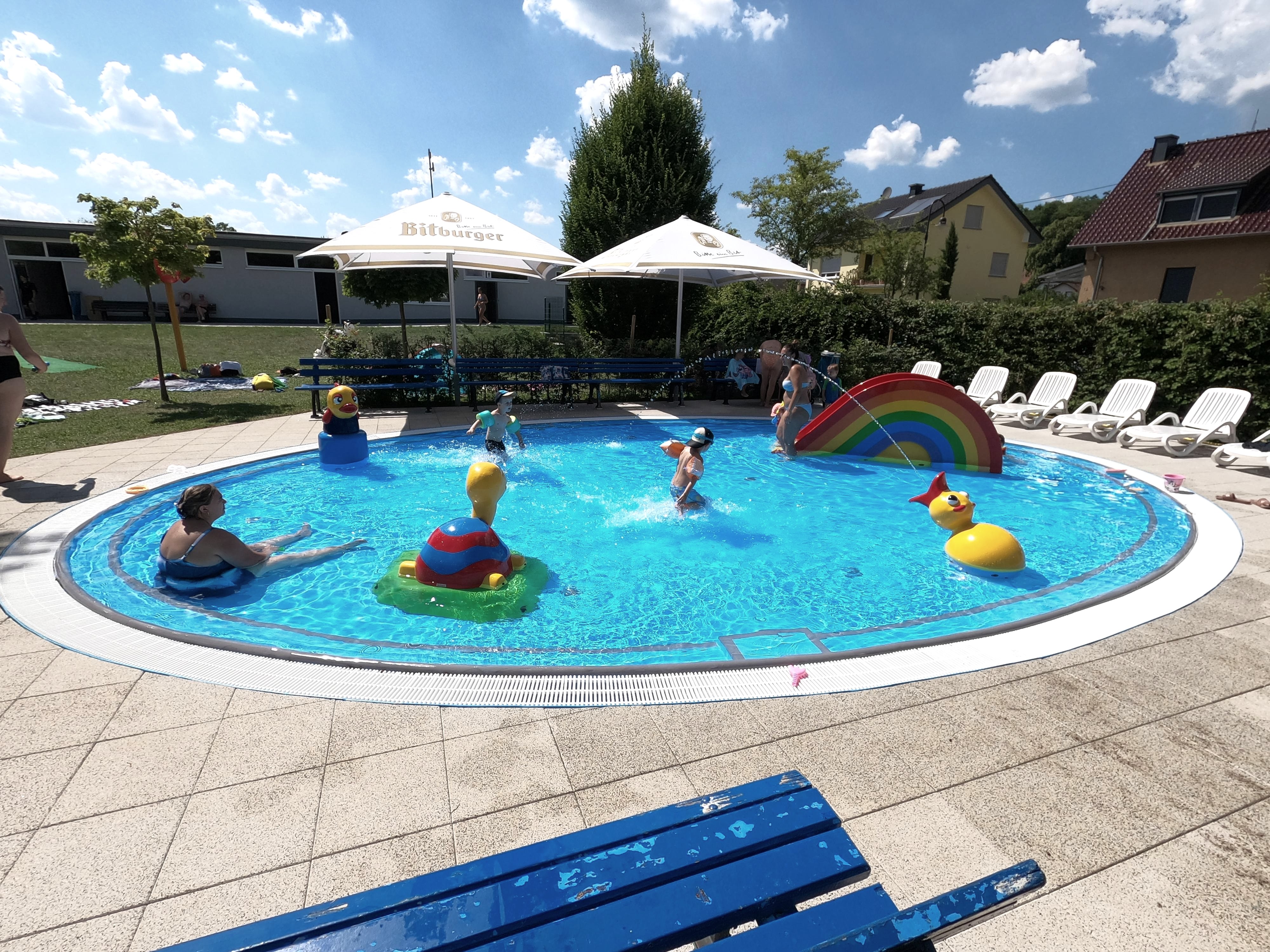 Eintauchen, abtauchen, wohlfühlen: Das Freibad Echternacherbrück bietet ein Wettkampfbecken mit Sprunganlage, ein separates Schwimmerbecken, ein Nichtschwimmer-Becken mit sprudelnden Wasserpilzen und Rutsche sowie ein separates, liebevoll gestaltetes Planschbecken für die Kleinsten.