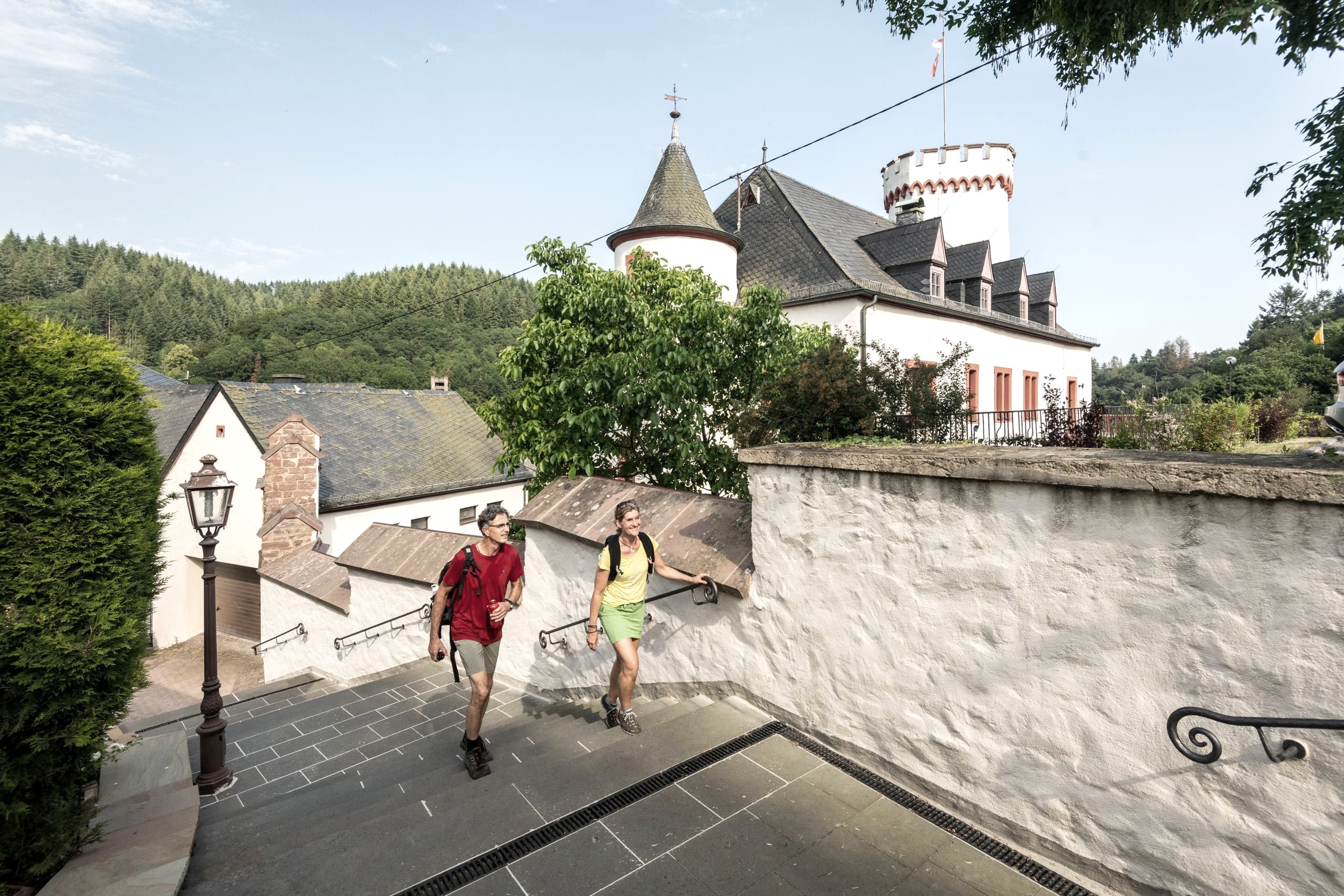 Neuerburg bildet eine Pilgerstation auf dem Jakobsweg von Köln nach Trier. Cafés und Restaurants laden zu einer Rast ein.