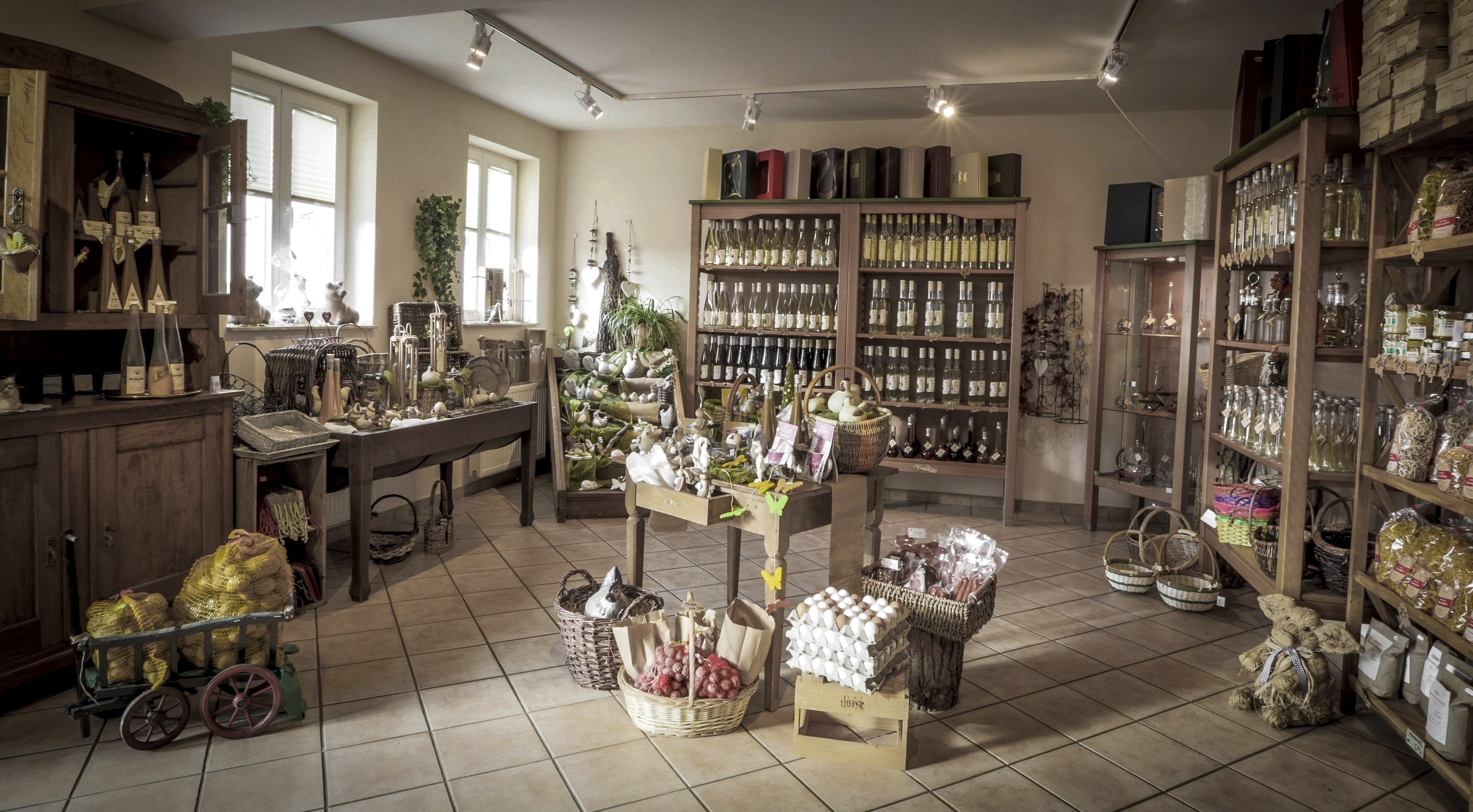 Produkt-Angebote: Eifeler Edelbrände, Liköre, hausgemachter Eierlikör, Eier, Wurst in Dosen, Schinken, Salami, Nudeln, Honig, Kartoffeln.