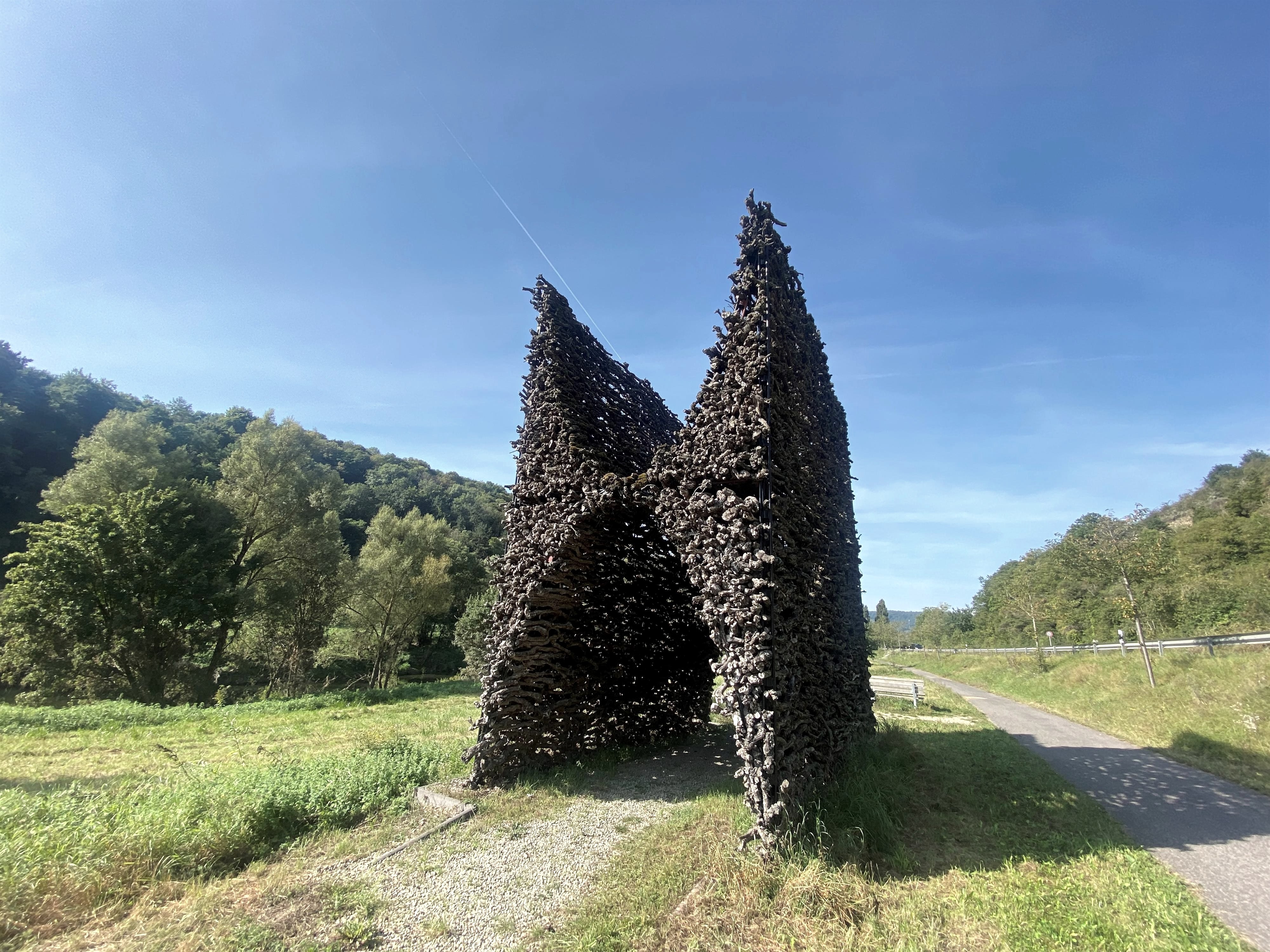 Zwischen dem Weinberg und der Sauer steht am Sauer-Radweg eine Skulptur aus etwa 3.000 alten Rebstöcken: Das Weintor.