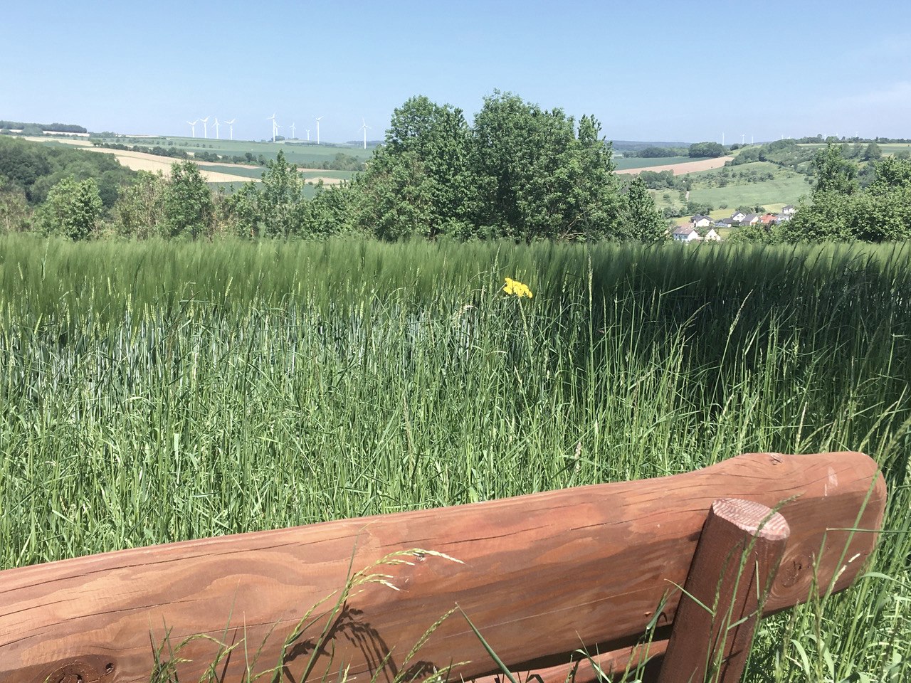 Wir verlassen den Parkplatz am Stausee in Richtung Ortskern von Biersdorf. Auf einem gemulchten Wiesenweg geht’s hinauf, vorbei an Streuobstwiesen. An einer scharfen Abzweigung wandern wir nach rechts vorbei am Friedhof auf den Erzberg und biegen dann nach links über die Wiesen, vorbei an Feldern und Weiden. Überall werden wir mit atemberaubenden Ausblicken auf die umliegenden Dörfer belohnt.