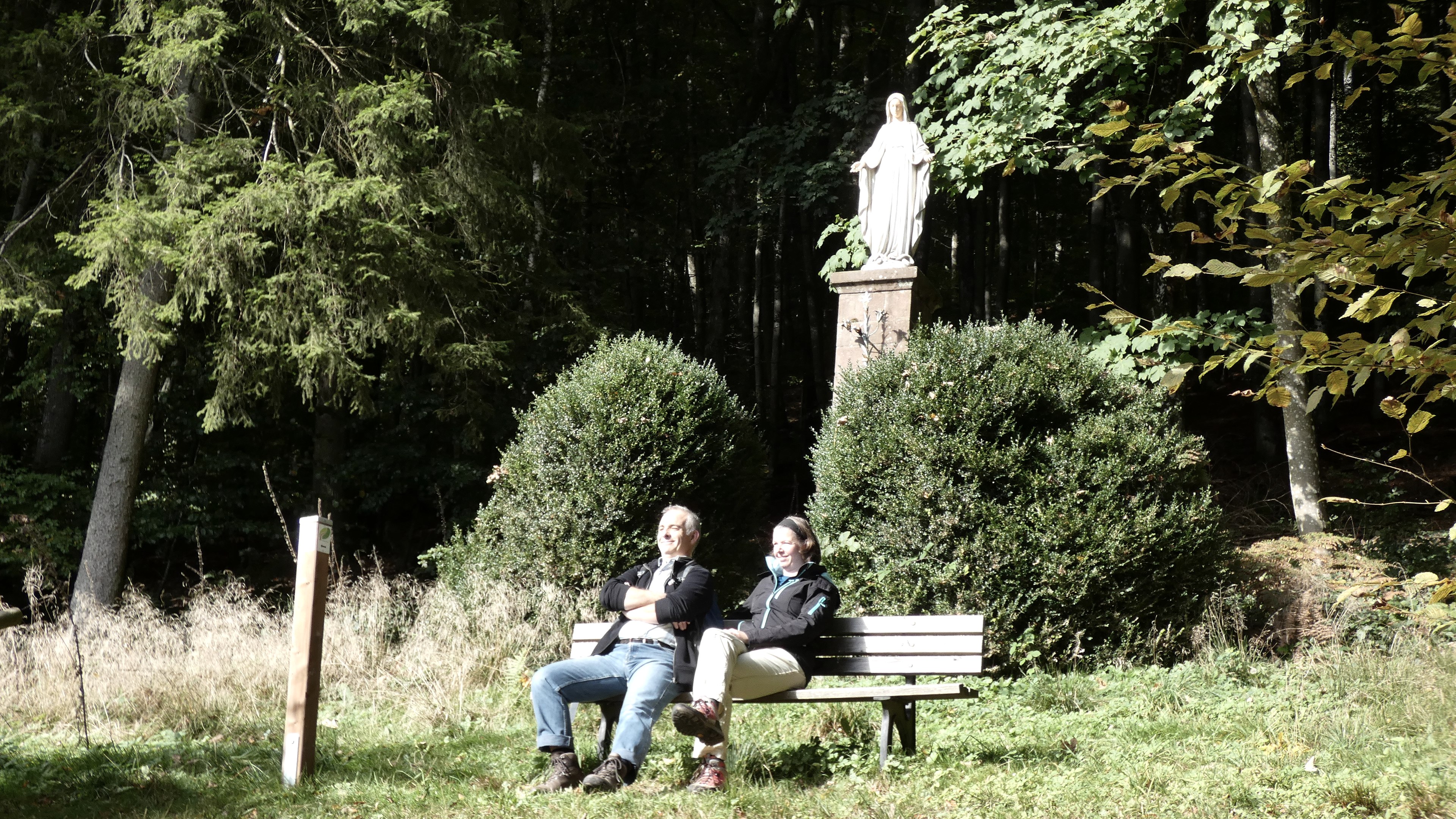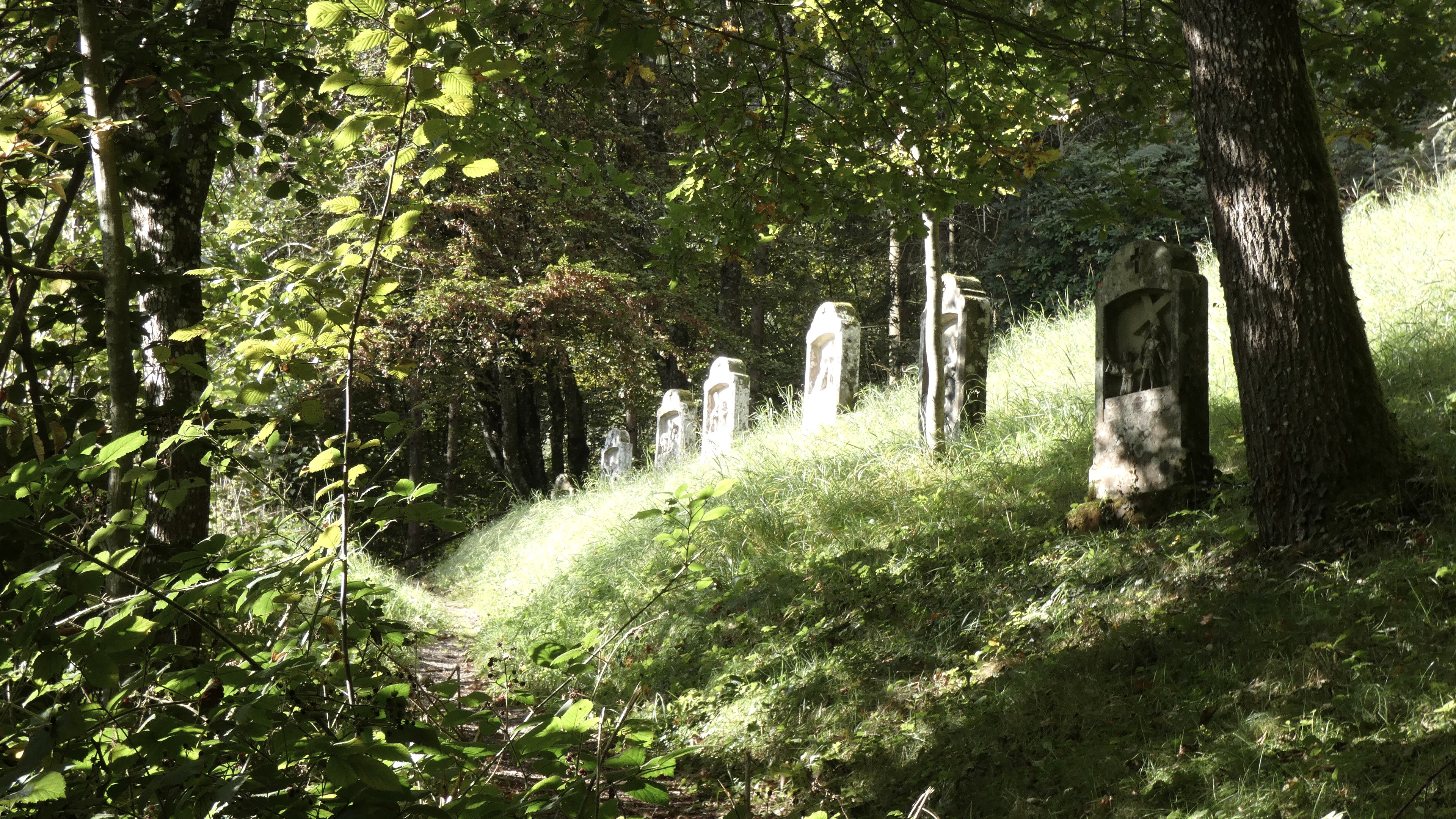 Und wieder geht es den Berg hinauf, entlang der Straße. Wir verlassen diese an einer Kehre und folgen dem Weg durch den Wald. Auf dem relativ ebenen Weg, der vorbei an einer Schutzhütte führt gelangen wir nach einiger Zeit zum Hinweisschild, das uns zur Einsiedelei bringt. Der Abstecher lohnt sich und sowohl der Kreuzweg als auch die Kapelle sind die Mühe des Aufstiegs wert. Danach erreichen wir wieder unseren Weg. Wir überqueren die Straße und gehen dann am Ufer zurück in Richtung Staumauer. Nach der Überquerung folgen wir dem Ufer des Sees zurück, vorbei an den Sandsteinformationen des Rotlay, die noch Spuren der Bearbeitung von Mühlsteinen zeigen, bis zu unserem Ausgangspunkt.