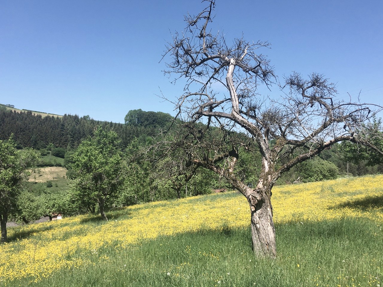 Diesem folgen wir auf einigen Kehren bis nach Hermesdorf. Man läuft zum Teil auf engen, romantischen Wiesenpfaden vorbei an dichtem Gebüsch.