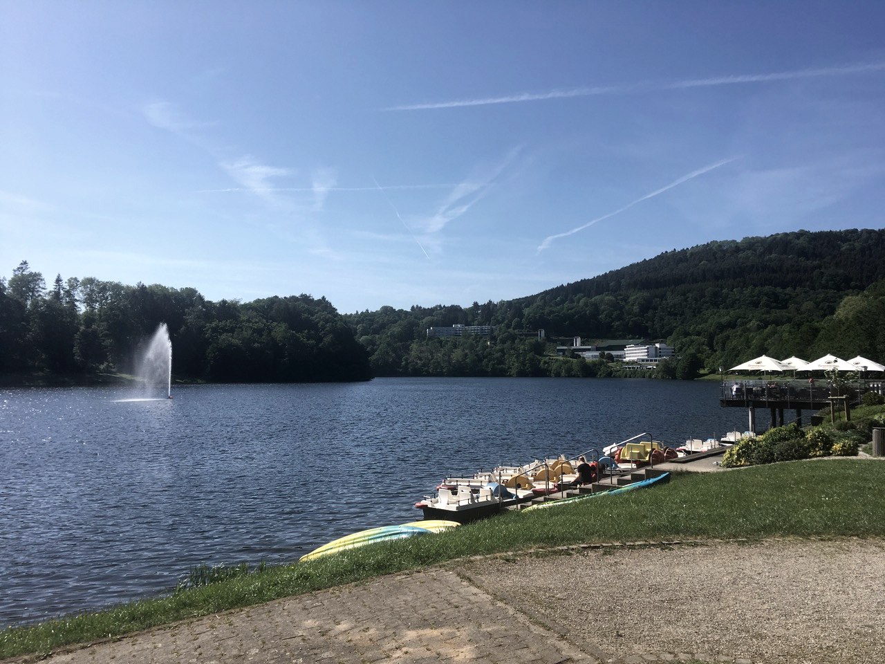 Danach geht’s kurz wieder Richtung Tal. Dann biegen wir in die Bergstraße und folgen ihr, bis uns der Weg wieder nach rechts über die Höhe führt. Es geht steil bergauf zum Hochbehälter und dann durch den Wald, wo uns der Weg nach einiger Zeit bergab über schmale Pfade zu einem Wirtschaftsweg bringt.