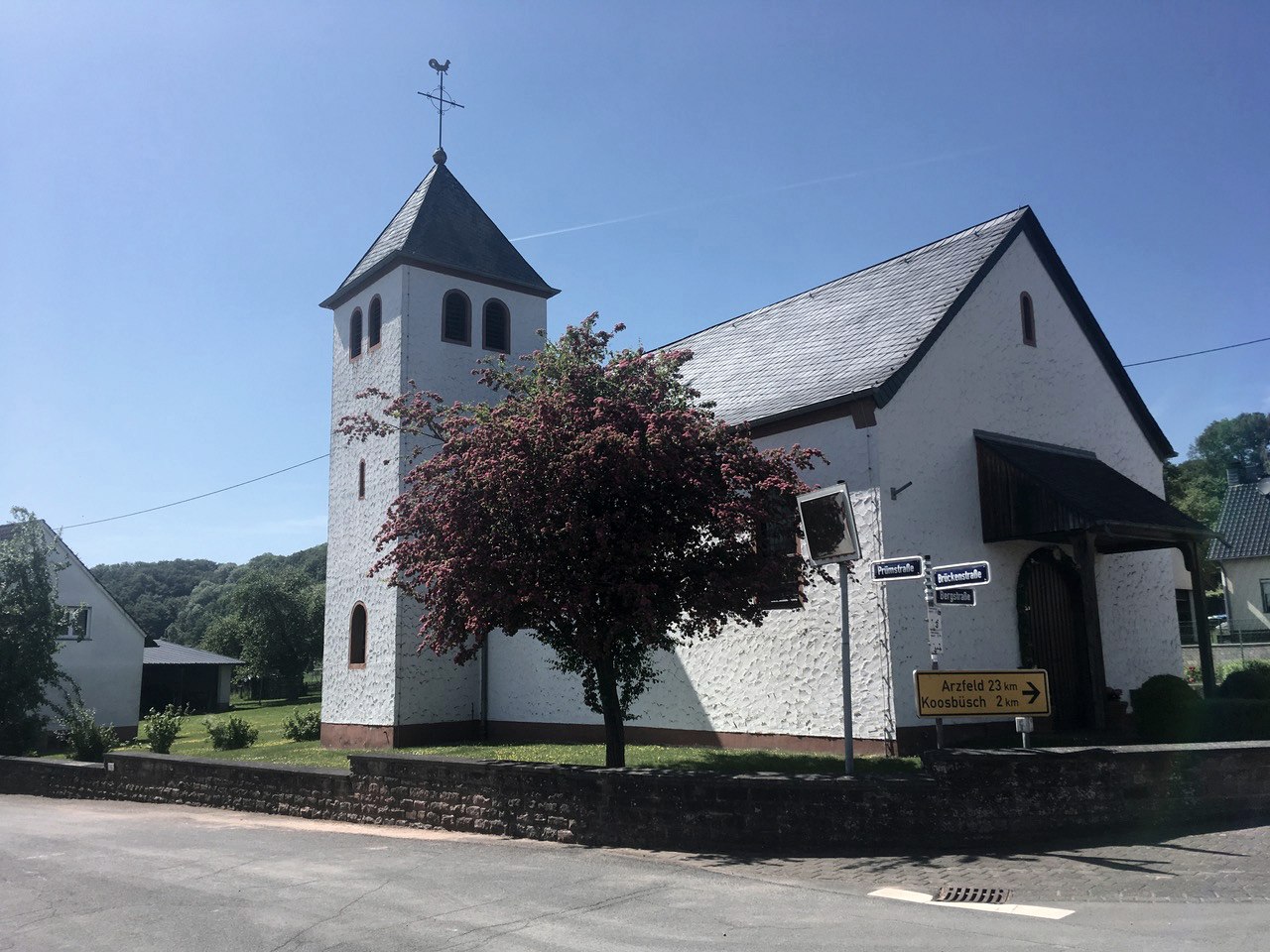 Nachdem wir die Landstrasse zum Stausee überquert haben, gelangen wir in den Ortskern von Wiersdorf. Hier lohnt ein Besuch der kleinen Kirche St. Markus und Johannes.