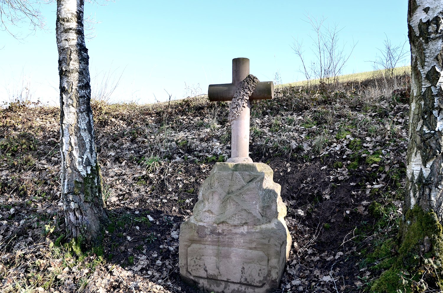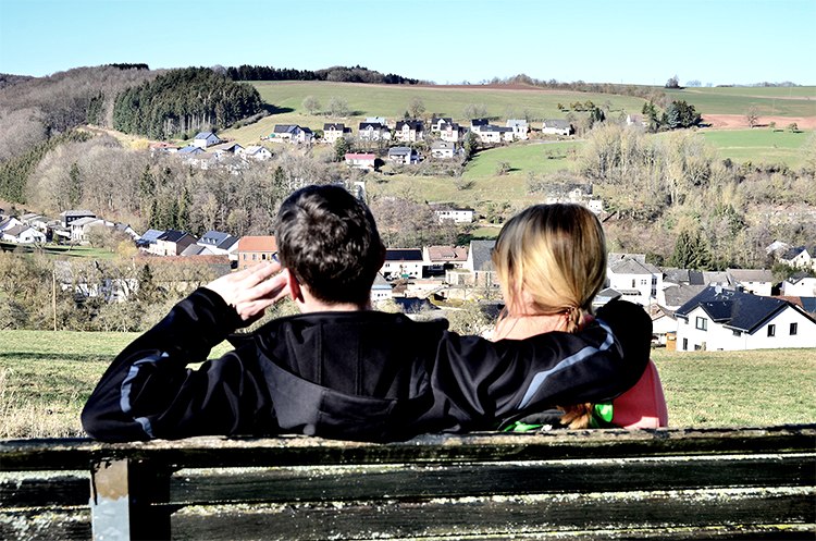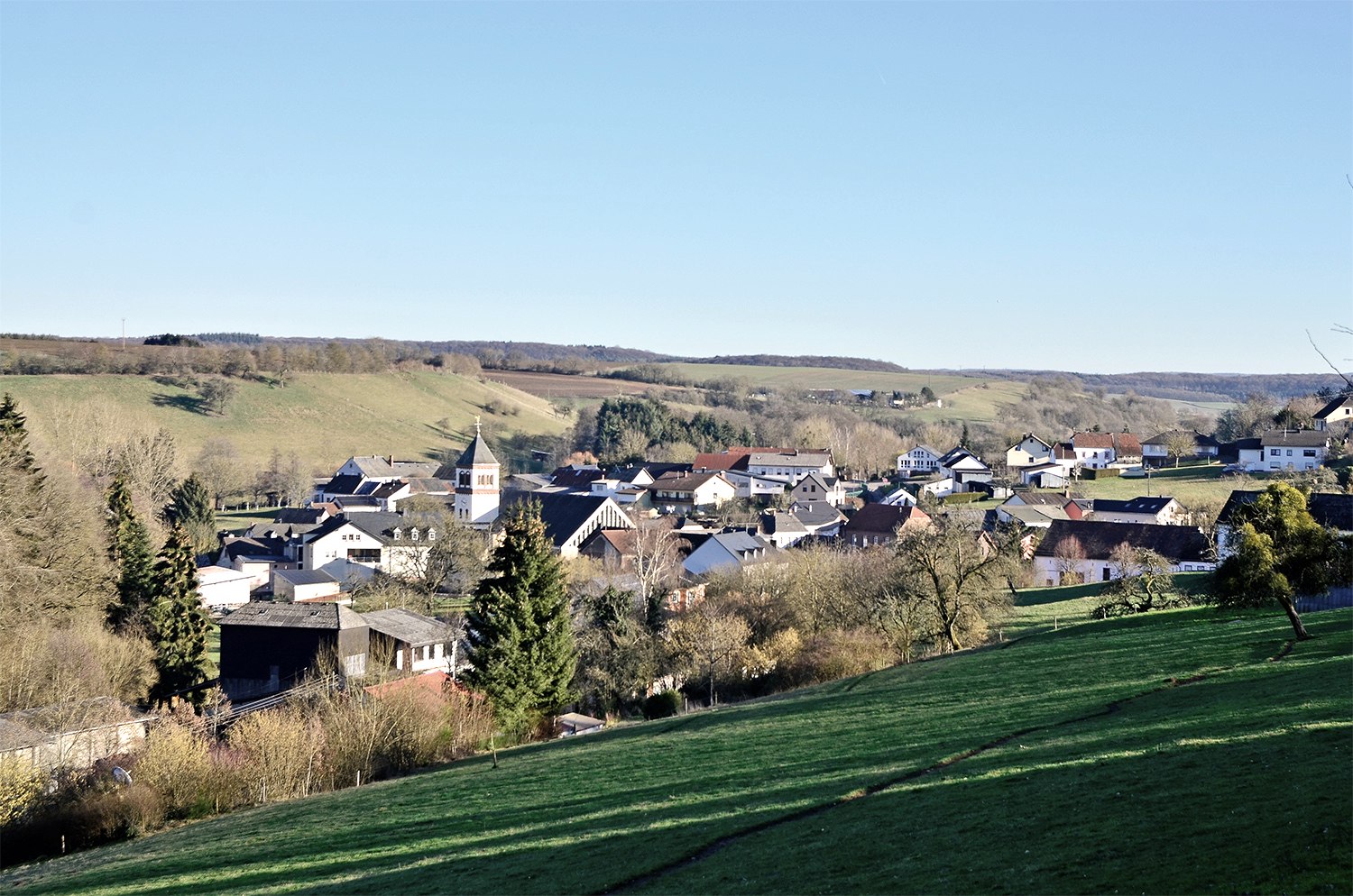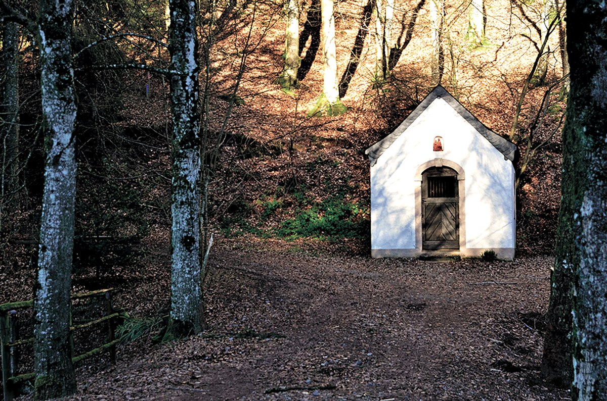 Nach wenigen Metern biegt man nach rechts in den Bruchweg ein, der nach kurzer Zeit verlassen wird, um erneut nach rechts abzubiegen. Über eine schöne Holzbrücke quert man den Mühlbach, der hier „Bouster Baach“ genannt wird. Sein Plätschern begleitet eine Weile die Wanderung. Bevor das Waldstück links abbiegend verlassen wird, zeigt sich am Waldrand eine malerische Kapelle, die zum Verweilen einlädt. Für ein harmonisches Gesamtbild sorgen der Hütterscheider Bach und der Udersbach, die nahe der Kapelle zusammenfließen. Die Straße gekreuzt, geht es nach rechts, steil hinauf vorbei an Wiesen. Oben angekommen hat man einen schönen Blick auf Baustert mit der herausragenden Kirche und den umliegenden Wäldern. Vorbei am Sportplatz zeigt die Markierung nach rechts in die Schulstraße. Nach einem kurzweiligen Anstieg führt der Wanderweg vorbei am Golfplatz in den Wald. Ruhende Moospolster, Waldmeister, Beifuß und andere Kräuter säumen den Wegesrand und mit etwas Glück hört man das Hämmern des fleißigen Spechts in der Ferne. Die Routenführung lenkt den Wanderer nach rechts, vorbei an Wiesen und Streuobstbäumen, nach Brimingen. Hier läuft der Wanderweg Nr. 78 parallel zur Nr. 77. Beide Rundwanderwege führen entlang Wiesen und bewirtschafteten Feldern, gemächlich einem Anstieg, auf eine Hochfläche. Von dieser bietet sich ein fantastischer Weitblick auf Utscheid, Weidingen, Hütterscheid und auf der anderen Seite zeigt sich die Silhouette von Bitburg mit seinen markanten Brauerei Türmen. Bei gutem Wetter reicht der Blick sogar bis in den Hunsrück. Der Wegeverlauf führt weiter durch die Gemeinde Brimingen, vorbei an altehrwürdigen Bauernhäusern durch die Straße Am Maarfeld und weiter nach links durch die Dorfstraße. Entlang des asphaltierten Feldweges säumen sich Wiesen und Felder. Hier heißt es: „Augen auf“, denn auf unserer Wanderung haben neun Rehe den Weg gequert. An der Hiseler Straße angekommen führt die Markierung nach rechts. Nach wenigen Schritten erblickt man ein Wegekreuz aus Sandstein, worauf bald ein nächstes Wegekreuz folgt. Zukünftig sollen Tafeln an den Wegekreuzen angebracht werden, die Wissenswertes über die Kreuze berichten. Die Hiseler Straße wird nach links in einen Feldweg verlassen. Weite Hochflächen bieten dem Wanderer einen beeindruckenden Panoramablick auf Baustert. Von einer Bank aus, bei der ein weiteres Wegekreuz steht, kann man den Ausblick ausgiebig genießen, perfekt für eine Rast. Von dort führt der Weg zurück nach Baustert, entlang der Straße Eisenknapp, vorbei am Eschbach, zum Ausgangspunkt an der Maximinstraße.