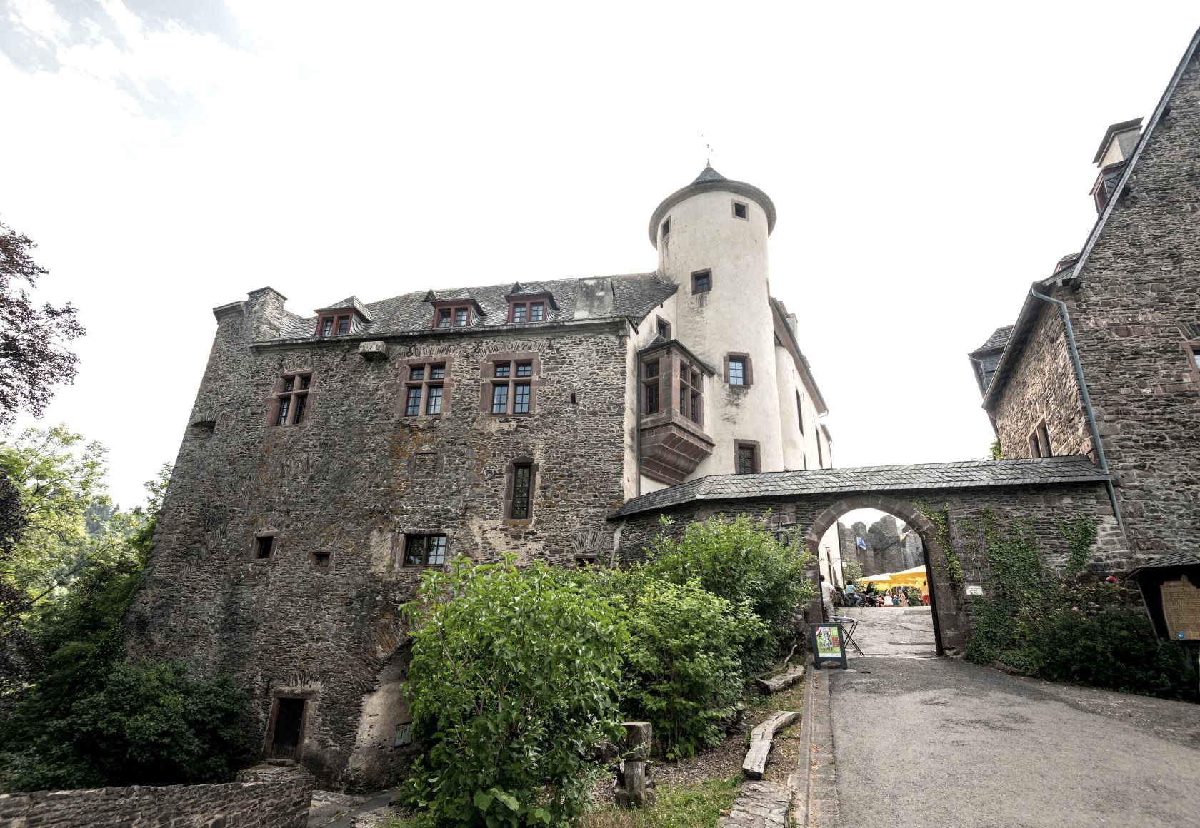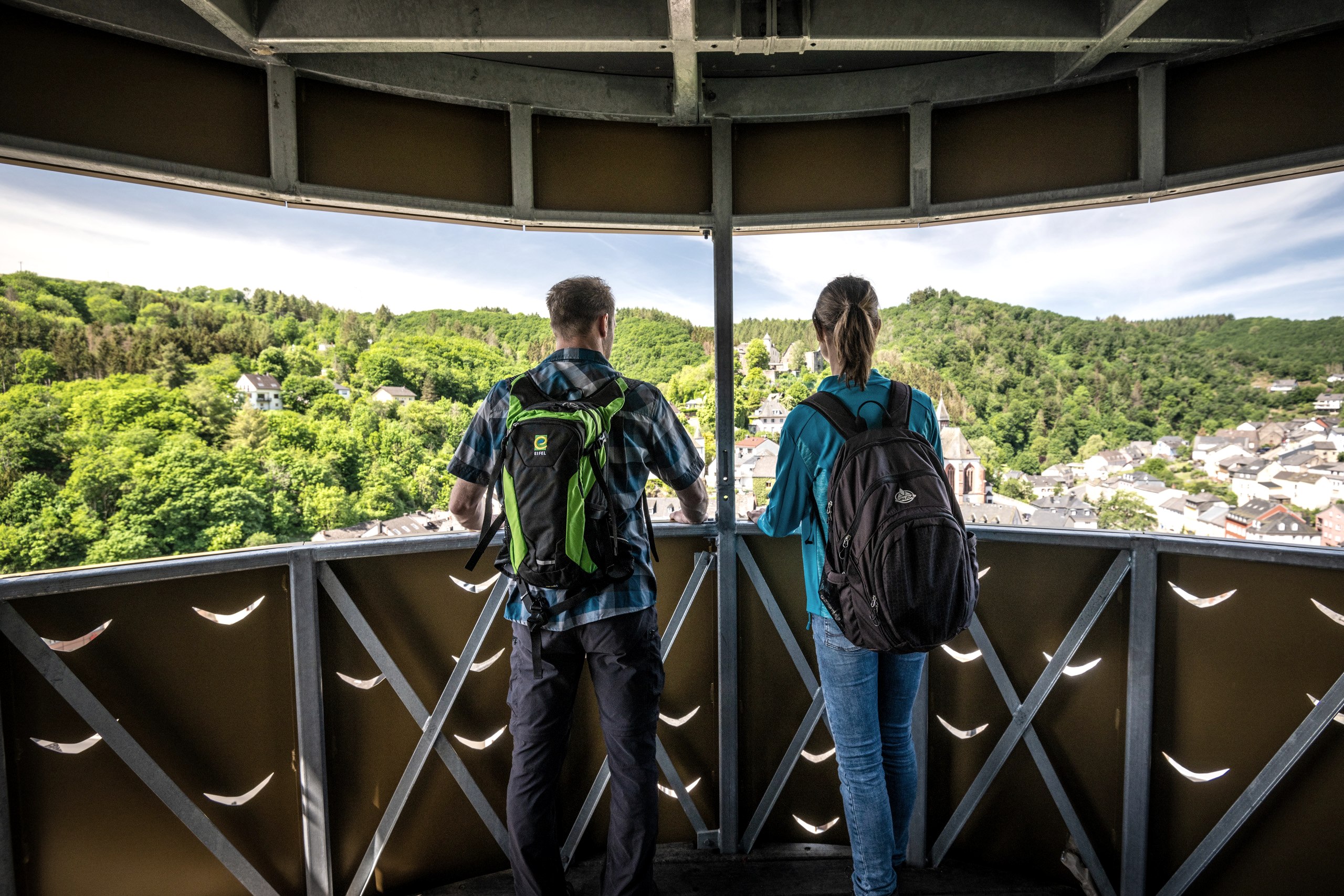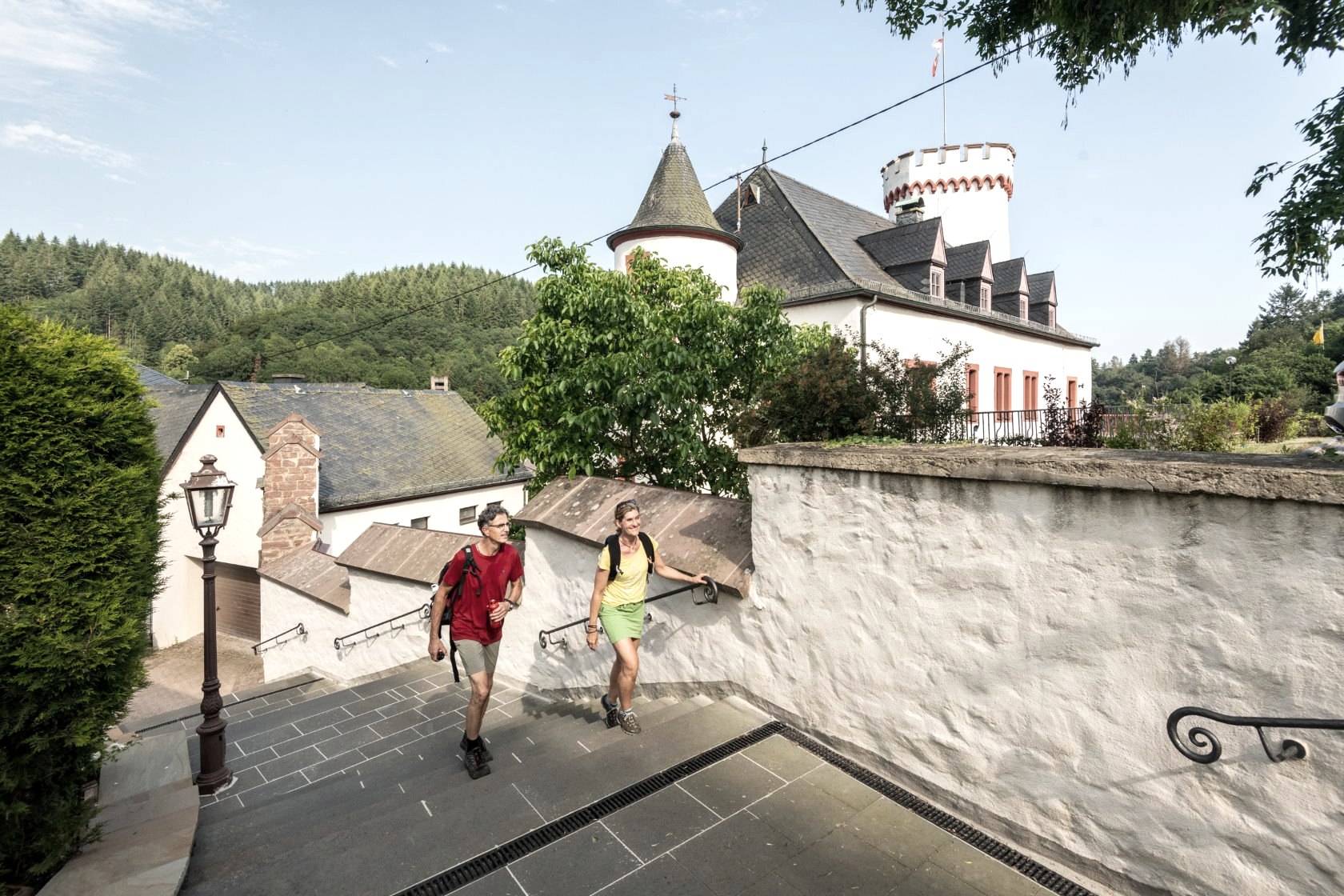 Hoch auf dem Schiefersporn thront die größte noch erhaltene Burg im Eifelkreis und blickt über die mächtige Kirche und das burgähnliche Pfarrhaus auf den Marktplatz von Neuerburg. Das historische Städtchen liegt im romantischen Enztal, umsäumt von bewaldeten Hügeln, die ihr auf eurer Rundwanderung queren werdet.