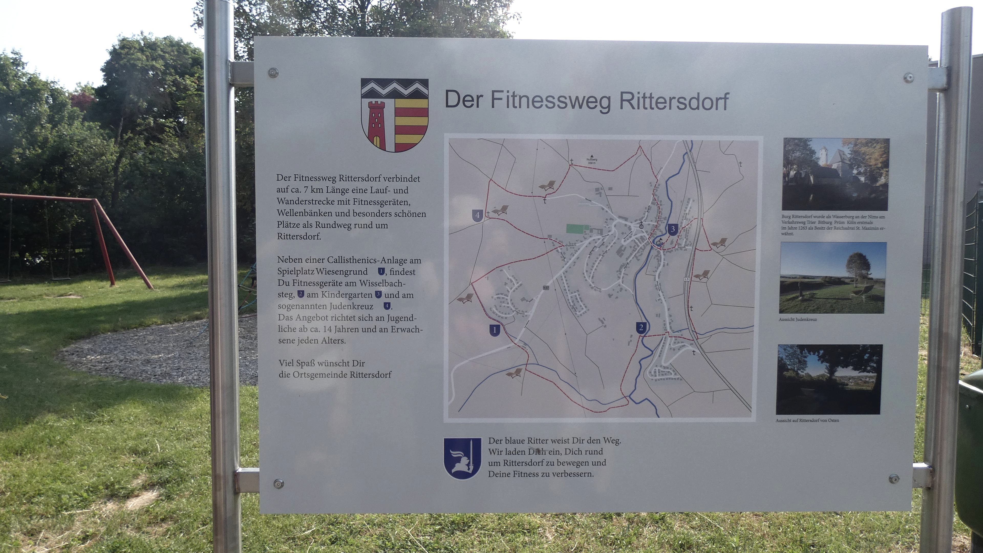 Der Fitnessweg Rittersdorf verbindet auf ca. 7 km Länge eine Lauf- und Wanderstrecke mit Fitnessgeräten, Wellenbänken und besonders schönen Plätzen als Rundweg rund um Rittersdorf.