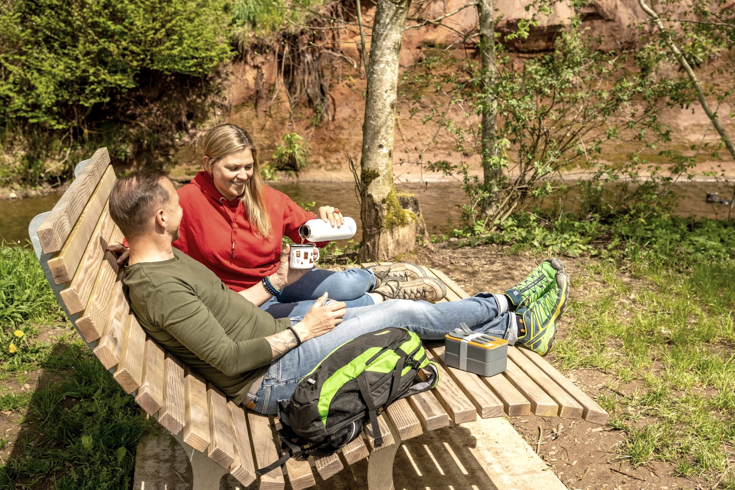 Eine gemütliche Holzliege mit Premiumblick auf den beeindruckenden Prallhang lädt als Rastplatz und zu einem Picknick ein.