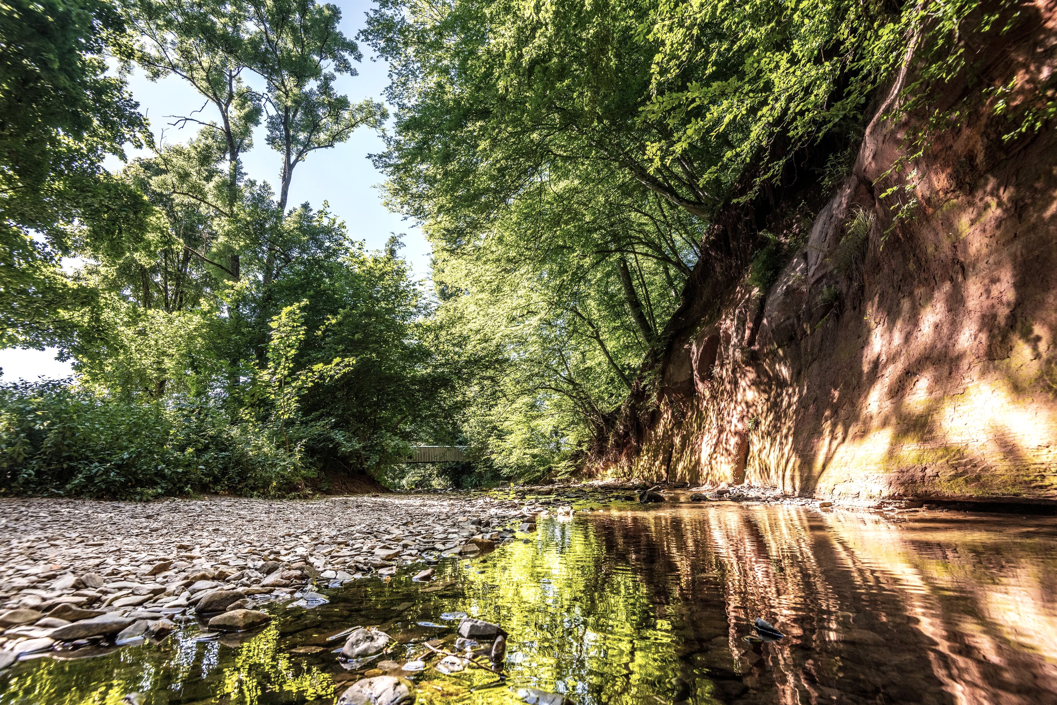 Am „Roten Puhl“ hat die Enz den mit Buchen bestandenen Hang in einer stattlichen Höhe angeschnitten. Hier steht in leuchtend orange-roten Farben das Gestein des mittleren Buntsandsteins aus dem Erdzeitalter der Trias an. Diese Ablagerungen in Fluss- und Deltabereichen sind ca. 220 Mio. Jahre alt.