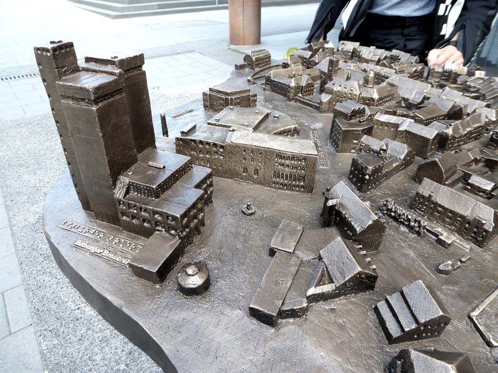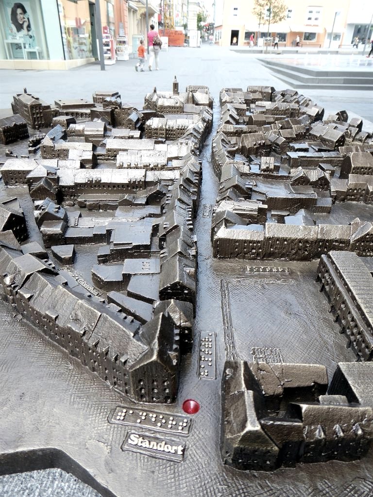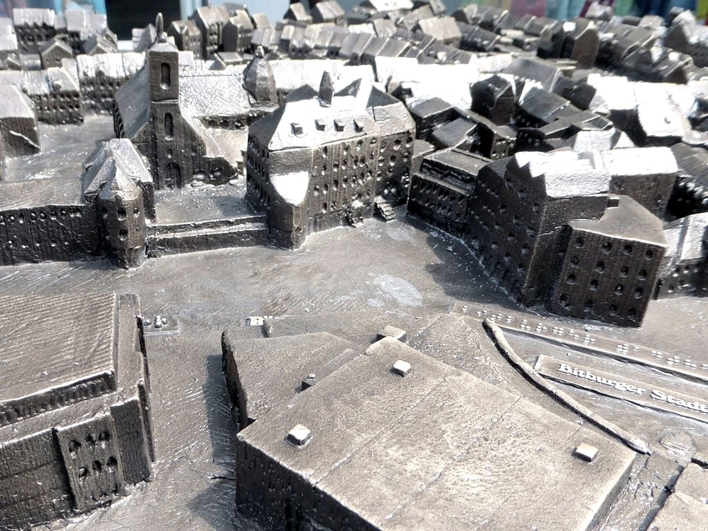 Die von der Dr.-Hanns-Simon-Stiftung gespendete Bronzeplastik steht am Spittel und soll insbesondere blinden Menschen ein Bild von der Bitburger Innenstadt vermitteln. Dazu sind an den wichtigsten Punkten Hinweise in Brailleschrift angebracht.