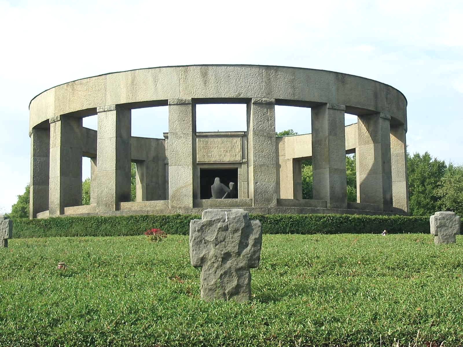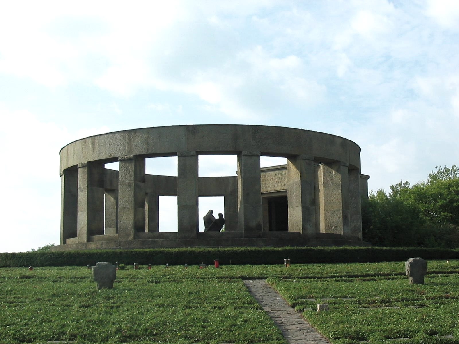 The war cemetery in Daleiden is the largest cemetery of honor in Rhineland-Palatinate with over 3,000 killed in World War II. The dead were buried on 72 smaller sites in the surrounding area until they were transferred to Daleiden. ln the natural slope of the slope, the rows of graves are arranged in the course of the heights, opened up by access and access routes to the individual graves, which are provided with a name stone. A retaining wall with a wall closes off the grave surface from the outside. Stations of the Cross lead to the cemetery. The cemetery of honor - instead of a small, baroque chapel - was built on a hill east of the village in 1954-59 to commemorate the soldiers of the Second World War who fell in the Eifel-Ardennes area. The tombs of 3,224 soldiers, laid out in several circular rows, run towards an open memorial room in the center of the ring. The memorial itself was designed as a pillar rotunda, in the middle of which is a stone Pietà in expressive forms. A memorial hall with the names of the fallen connects to the rotunda.
