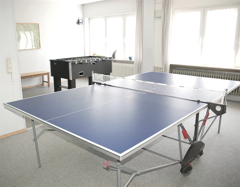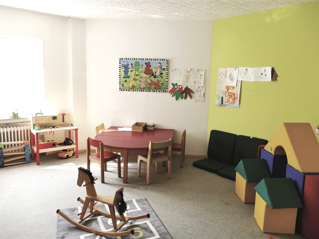 Outside there is a climbing-rock and a playground with swing.