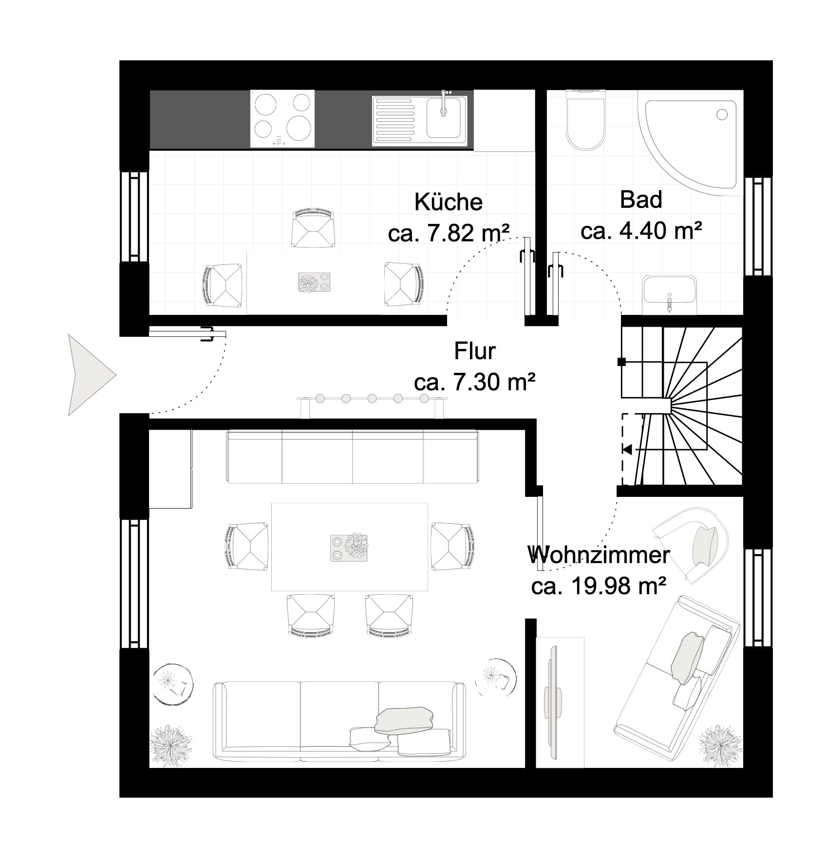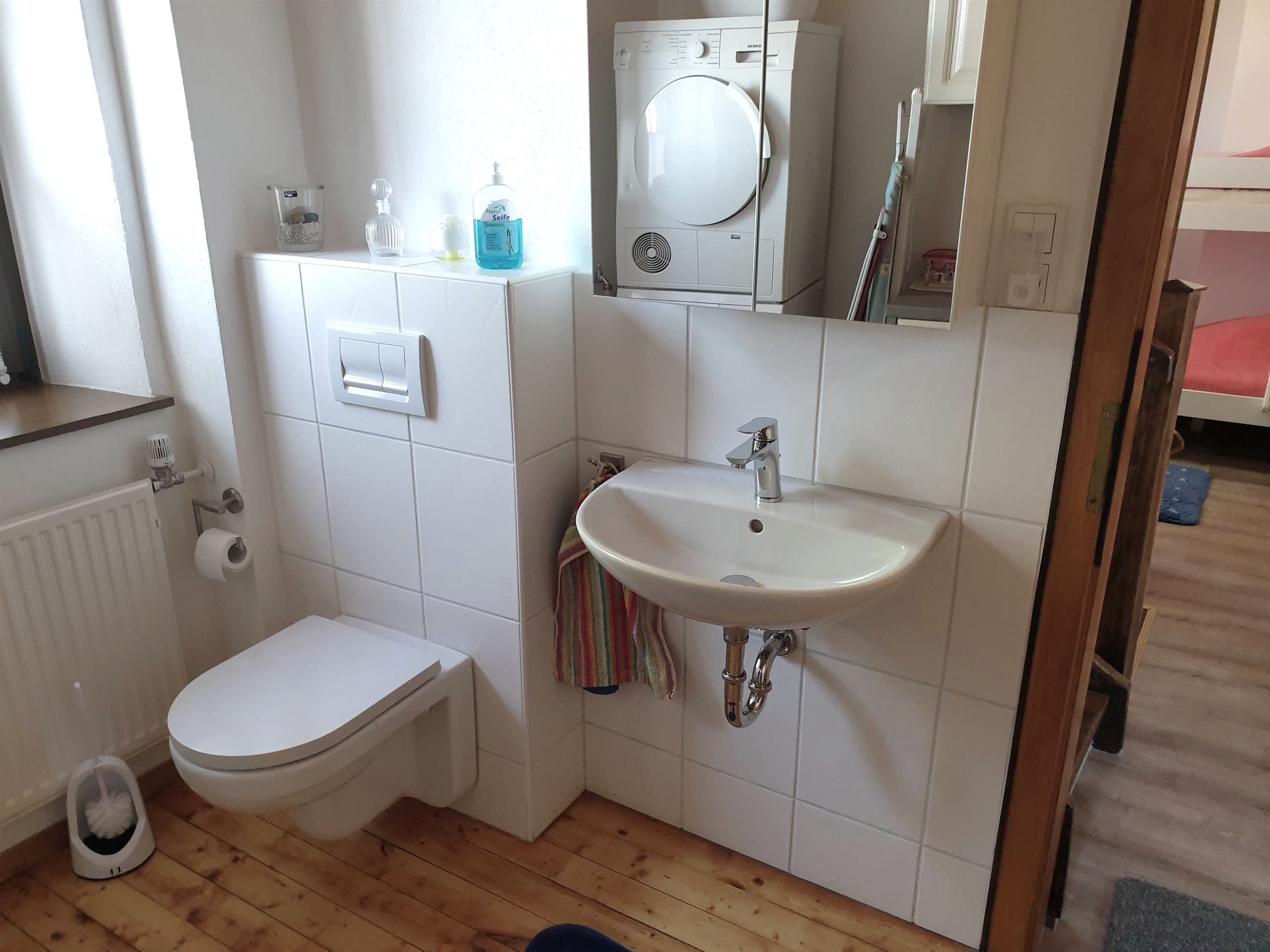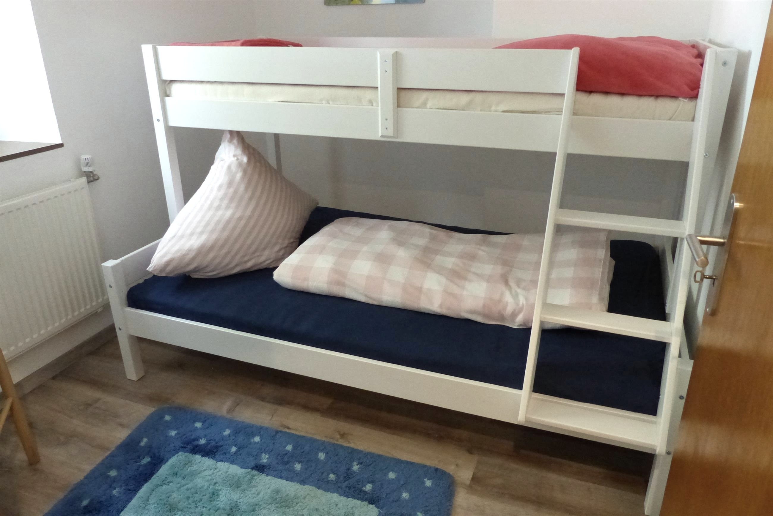 The kitchen with dining area, living / dining room and bathroom are spread over 2 floors on the ground floor. On the first floor are the three bedrooms, one with a bunk bed and two with a double bed, as well as a room with an additional toilet and sink, dryer and washing machine.