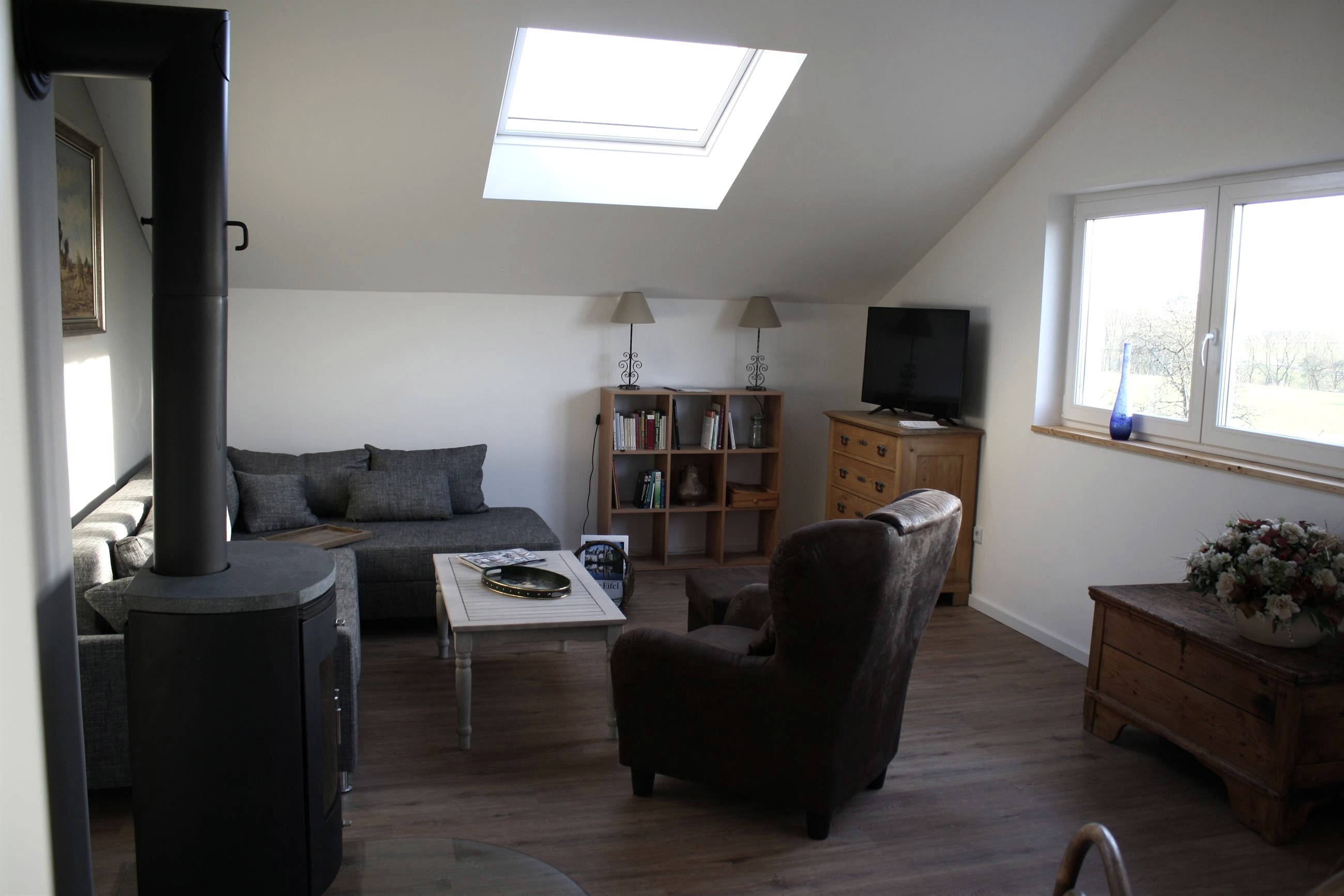 The Jacobshof is situated on a 3500 square meter property, surrounded by several old farmsteads in Oberstedem. The large garden offers many opportunities for activity, secluded corners invite you to relax, there is a barbecue area, garden furniture and parasols are available. There are plenty of games and books for bad weather, and FeWo Eifelblick has its own library with several hundred books ranging from novels, thrillers and Eifel literature to art and history. The vacation home "Le Coq" also has its own sauna.