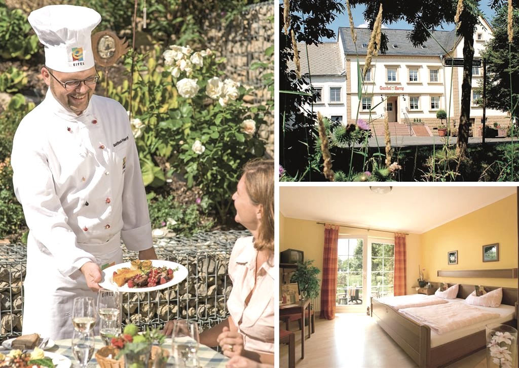 Our guesthouse was voted "20 Best Country Inns in Rhineland-Palatinate" by the SWR radio station. Due to its location in a typical Eifel village (Meckel won a gold medal in the 1997 competition "Our village should become more beautiful"), it offers you ideal possibilities for a holiday in the Eifel. The area around Meckel is ideal for excursions, in a short time you can explore completely different landscapes (Moselle, Saar, Bitburger Gutland, Luxembourg, Islek, Volcanic Eifel etc.). The beer town Bitburg is only 10km away, Trier 25km and the border to Luxembourg is only 10km away. Since 1 January 2005 we are a certified company under the umbrella brand EIFEL. We work even more closely than before with companies and service providers from the region to ensure that added value and purchasing power are kept in the Eifel. This begins in our kitchen with the purchase of fresh meat from Eifel animals, cheese from Eifel milk and does not end with schnapps and apple juice from Eifel orchards. You will not find Argentine steaks, Spanish ham and New Zealand lamb on the menu of our EIFEL inn. Our restaurant, which is known throughout the region, will spoil you with original Eifel dishes and international specialities, which of course are also prepared with Eifel ingredients.
