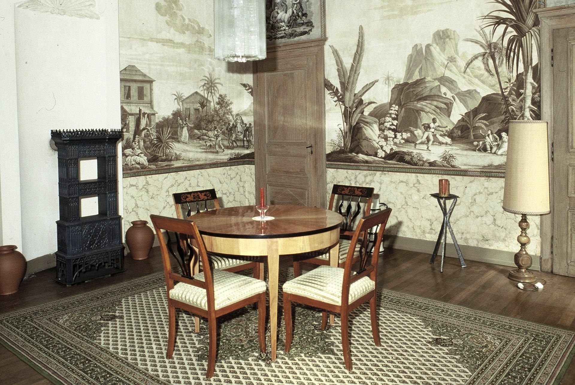 On the first floor of the manor house is the so-called "wallpaper room" from 1824, which is decorated with a unique wallpaper by the famous Parisian art print shop Dufour. The wallpaper depicts the unhappy love story of "Paul and Virginie" based on the novel by Bernardin de Saint-Pierre.