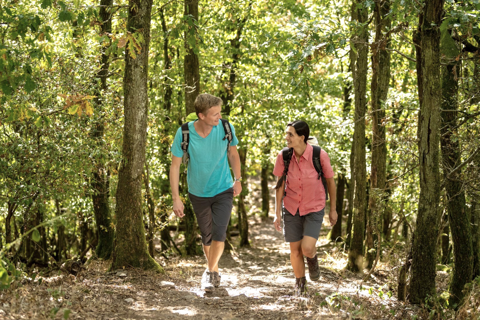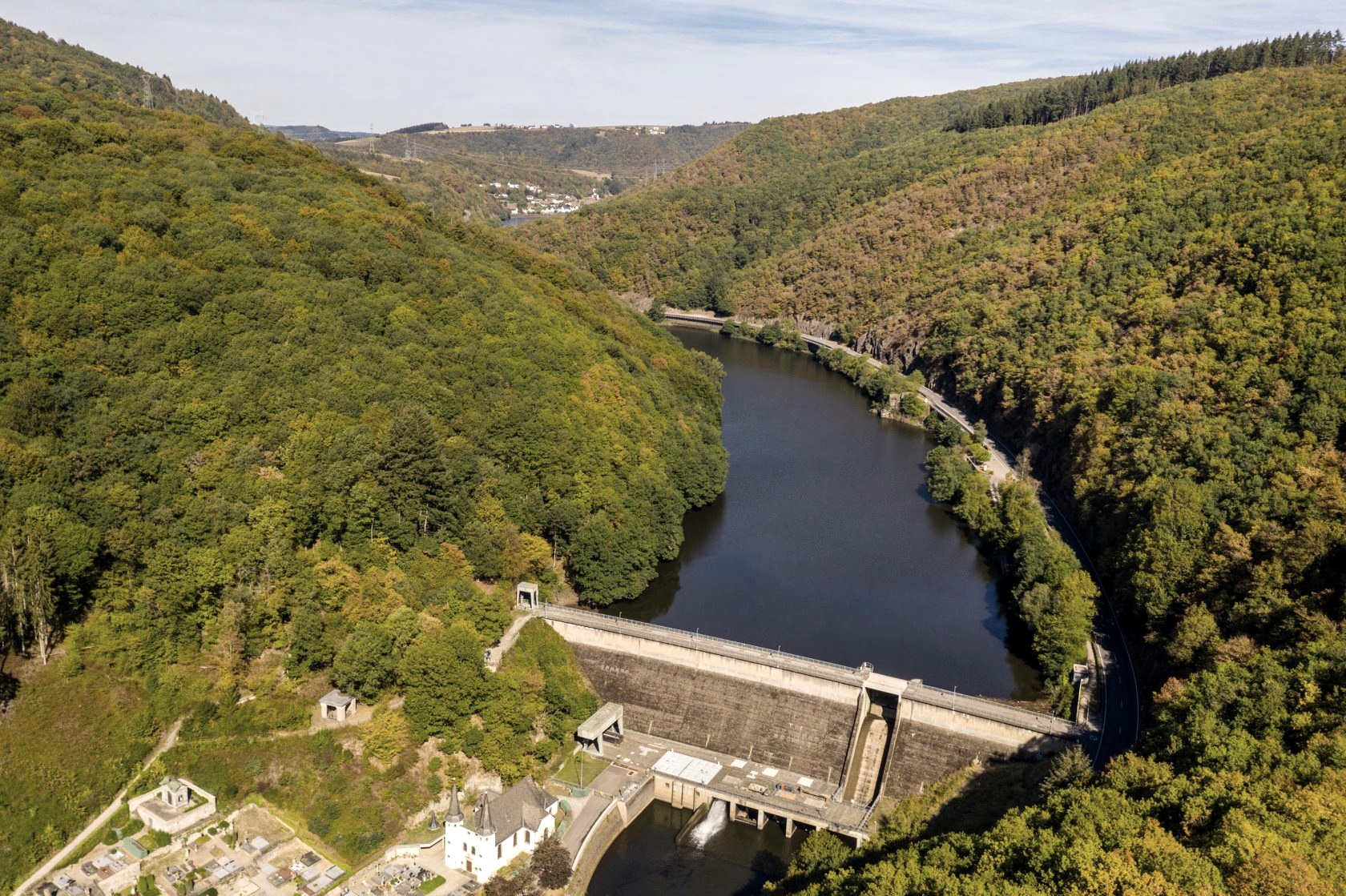 The Nat'Our-Route 5 starts in medieval Vianden, a little south of the worth seeing St. Rochus church, which is clearly overlooked by the dam wall. You turn uphill towards the rebuilt castle of Vianden, one of the most important and powerful castles in Europe. The castle is worth a visit of several hours. Now you leave it on the left, quickly gain altitude via serpentines and reach the mountain station of the Vianden chairlift. From here, the route is a bit more leisurely through sparse mixed forest to the Bildchenkapelle, from where you have a magnificent view over the dammed Our and its valley. Downhill you circle the Turbine 10, which rises out of the mountain, and reach the "Ourdall-Promenade", which you follow to the blue bridge behind Bivels. After the bridge you are now on German soil. Uphill a forest path leads to the rocky spur on which the ruin Falkenstein is enthroned. The castle cannot be entered, but a small pavilion in front of the defiant entrance portal offers enchanting Sleeping Beauty romance with a view of the castle.