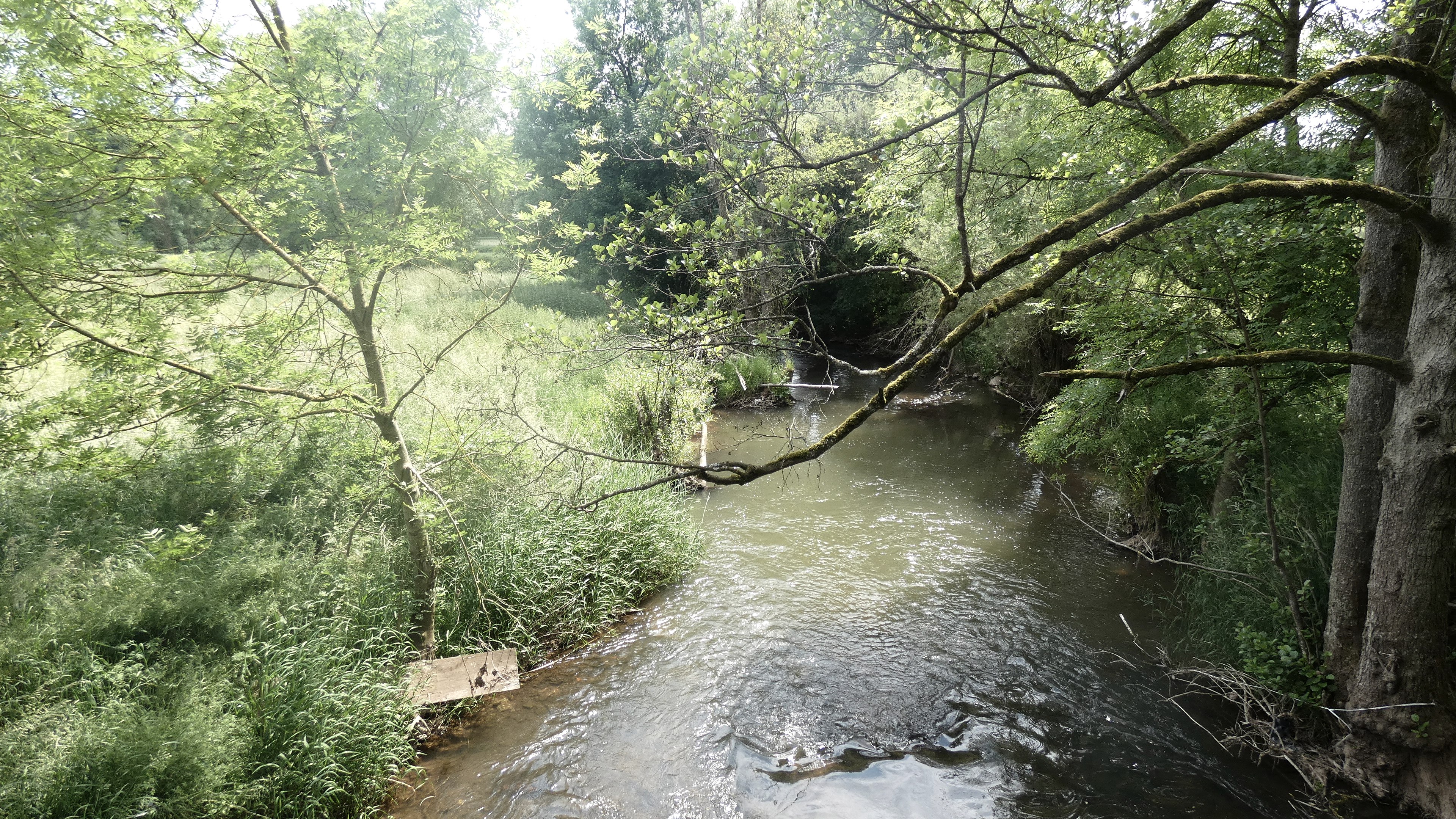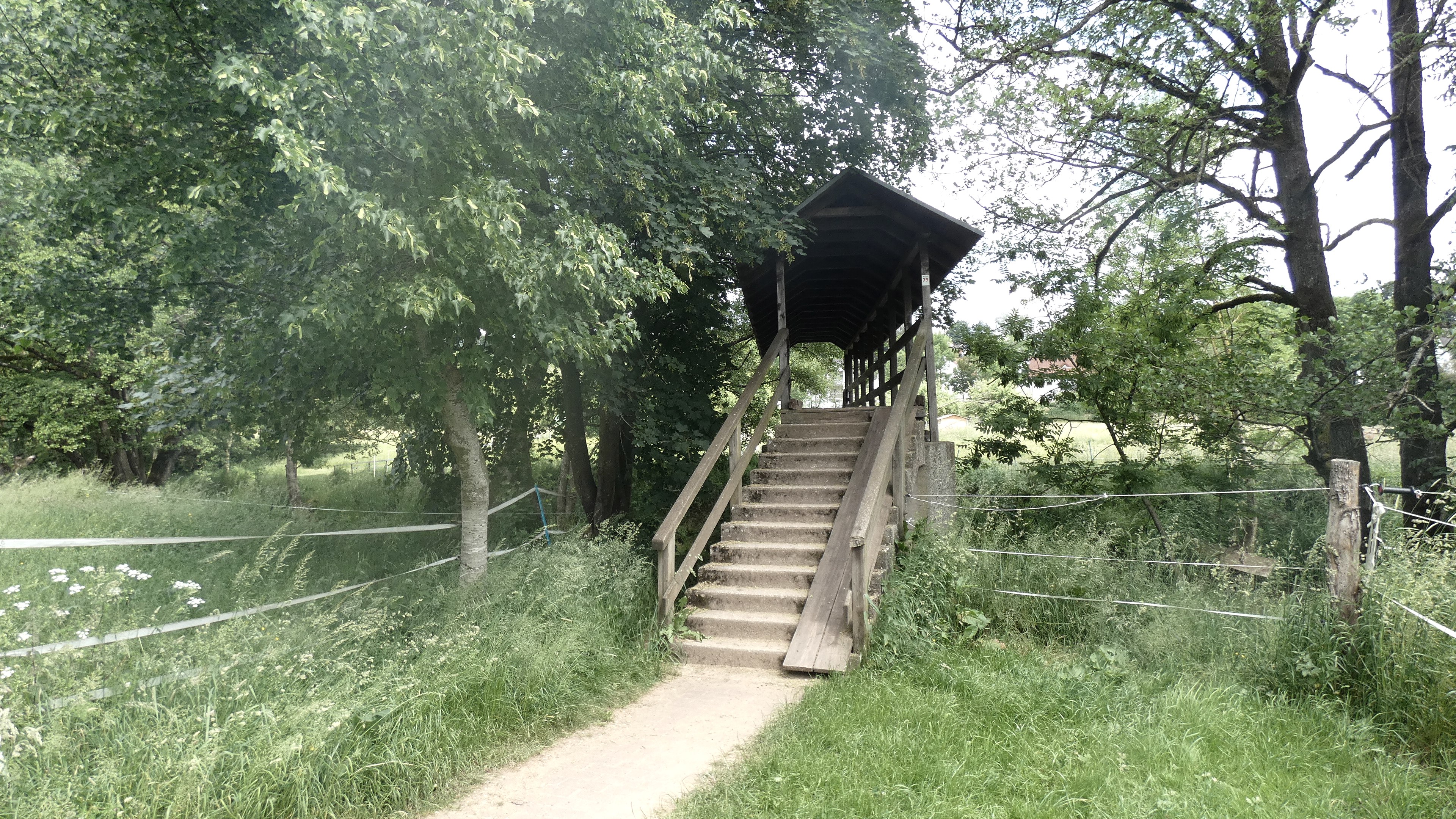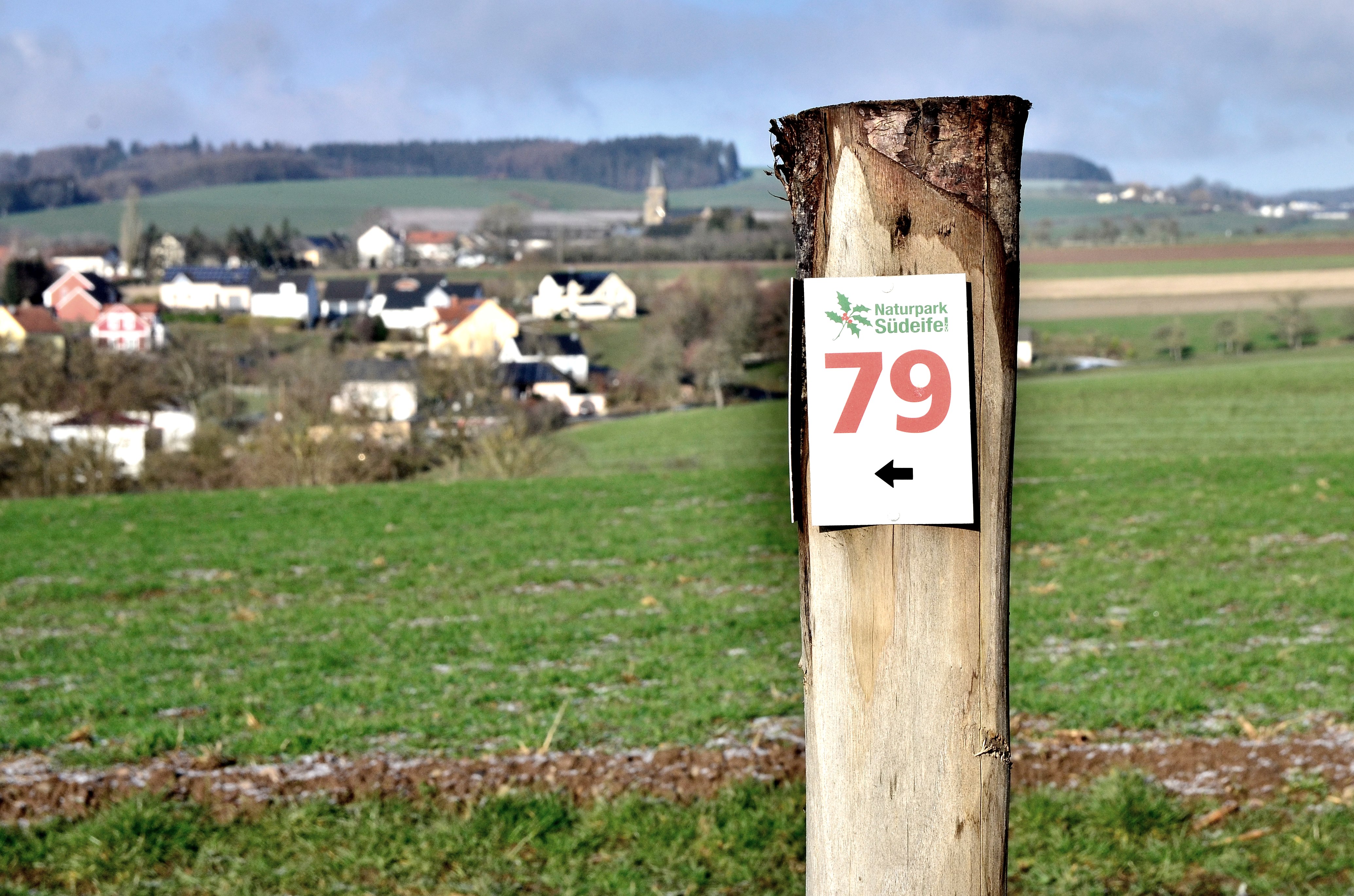 A refuge about 1 km from Wiersdorf is a good place to rest. We follow the field path. In the distance you can see the houses of the community of Biersdorf am See, as well as the tower of St. Martin's Church. The cawing of ravens follows our step. On the left, you can see the Bitburger Land golf resort. Follow the L7 for a short distance, before the crossroads leading to Hermesdorf, marker no. 79 points to the left into a farm track. To the left and right of the path is the golf course. With a bit of luck, you will spot a hare there, which hops quickly across the meadow into a bush. After the large golf course, there are fields and meadows along the way again. From the plateau, you again enjoy a magnificent panoramic view and after a few metres you can see the silhouette of the town of Bitburg on the horizon. A bench invites you to take a break. Along the meadows and fields, where horses and Zackel sheep, with their imposing turned horns, stand, the path leads past the soothing ripple of the Nims. Over a wooden bridge we reach the road Auf Hasselt and then the Bitburger Straße, which leads us back to our starting point.