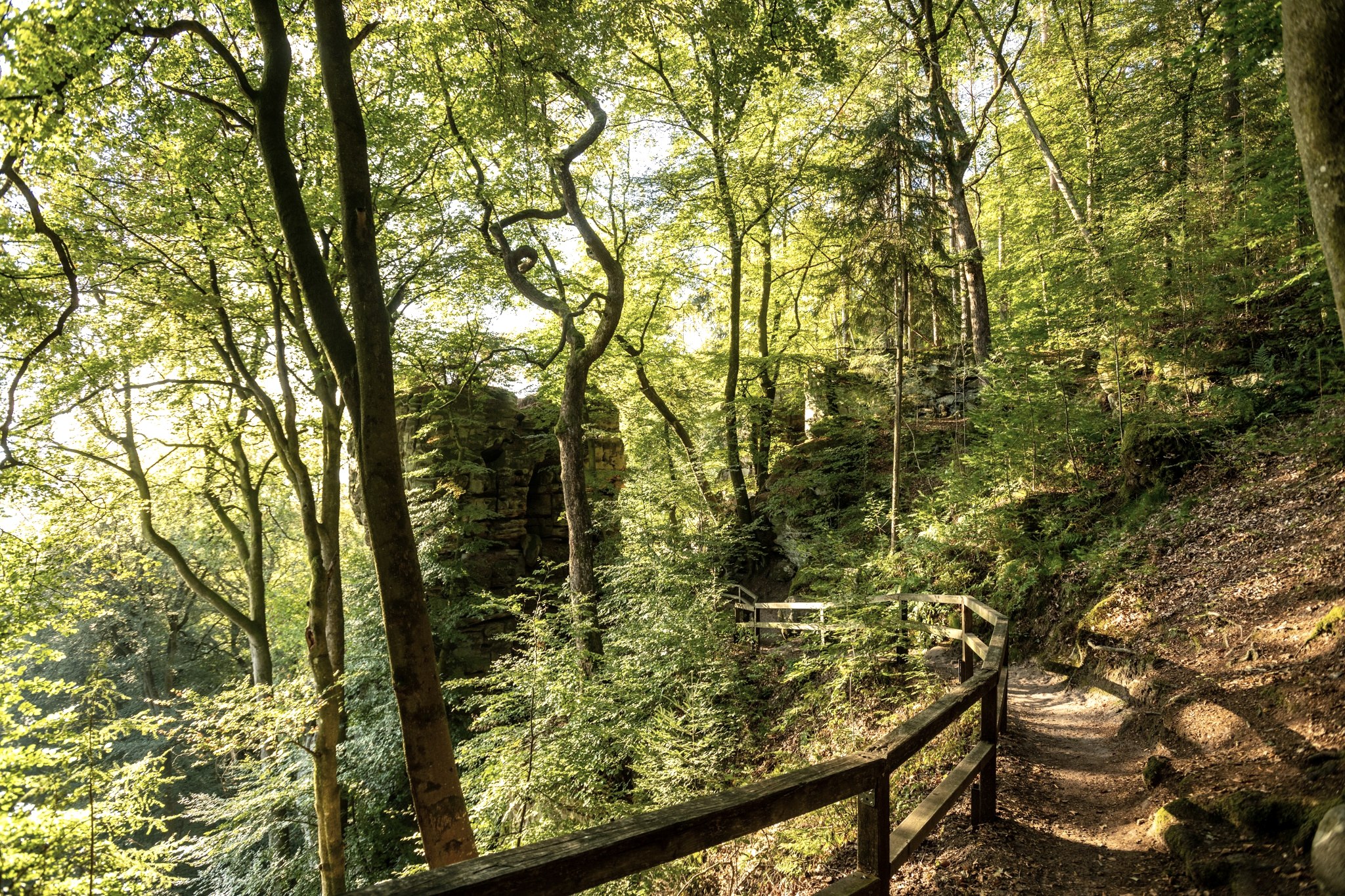 The highlights of this circular hike include the rock formations in the area of the Teufelsschlucht gorge and the rapids of the Prüm, the so-called "Irrel waterfalls". The ascent up to the Ferschweiler plateau on a narrow path along the small Hälbach stream is also an experience. This is followed by a hiking route on largely flat paths through the forest and across fields and a tour of the village of Ernzen.