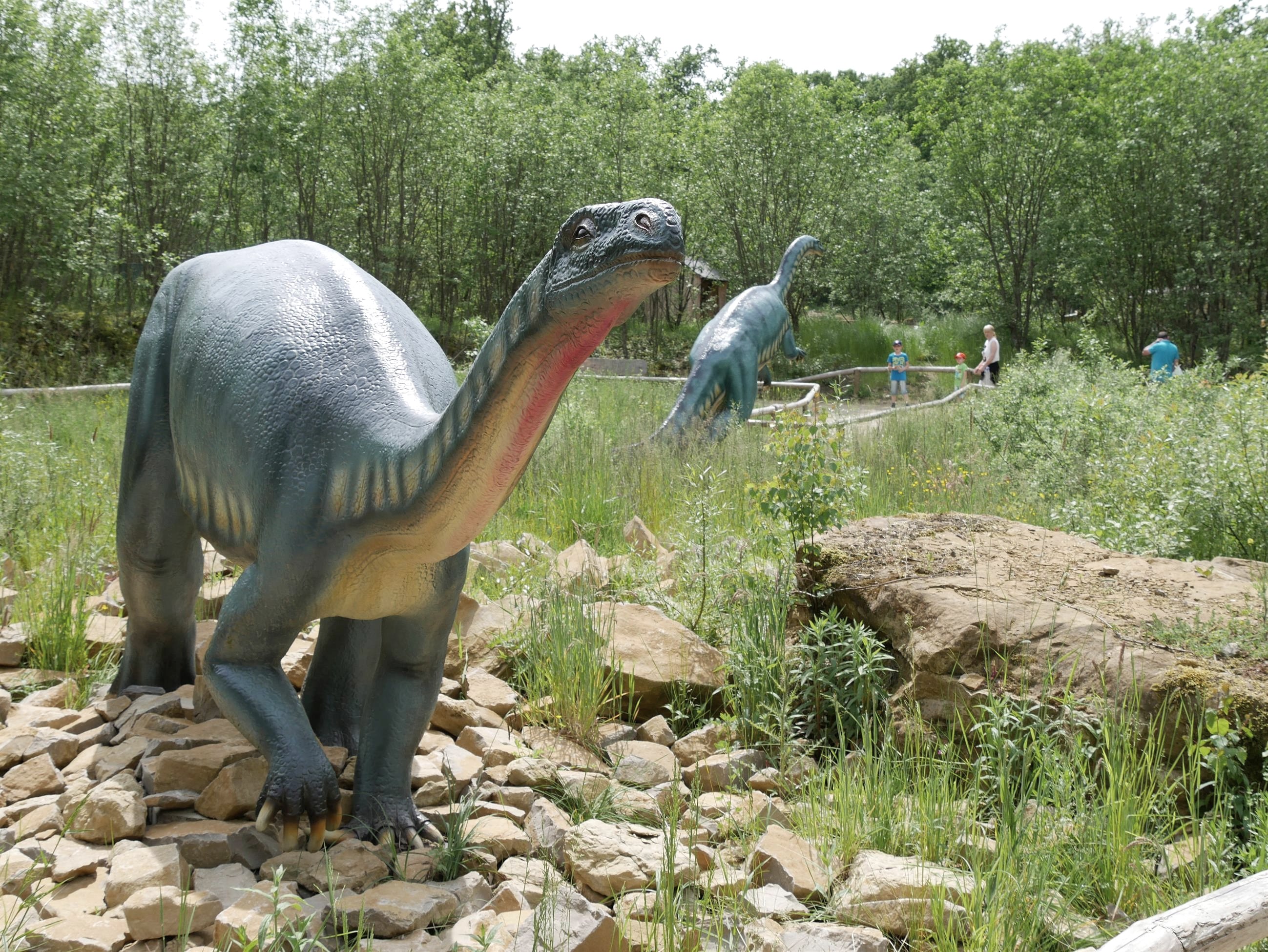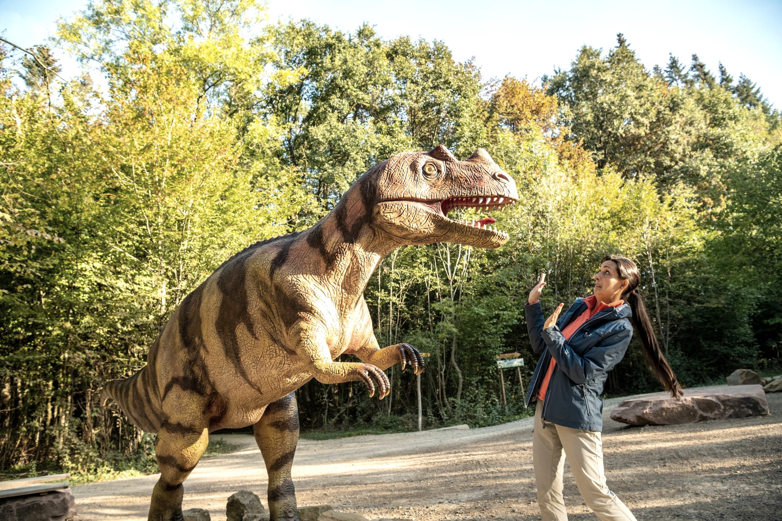On the almost 2 km long circular route through the extensive park grounds, visitors travel through the history of the earth - from the first land creatures to modern humans. The life-size models of animals and humans reflect the current state of scientific research. At the centre: the dinosaurs. Allosaurus and Stegosaurus, Triceratops and Velociraptor and, of course, the Tyrannosaurus Rex can be seen here alongside many other dinosaurs from the Jurassic and Cretaceous periods. At 45 metres long and more than 8 metres high, the Seismosaurus, the "earth shaker", surpasses all others in size; the model of this giant is the largest dinosaur model in Europe. A model of the Eifelosaurus (its real name ;-)), a prehistoric reptile whose remains were uncovered near Hillesheim in the Eifel, was made especially for the Dinopark. And of course, a star of the park is the Dilophosaurus, the Devil's Gorge dinosaur: The fossils of this large predatory dinosaur, which lived 200 million years ago, were found in nearby Luxembourg - in the same sandstone that makes up the Devil's Gorge! You can also meet a "Devilosaurus" here in the dinosaur park in Ernzen - a unique specimen. The father of the park mascot is the well-known Trier painter and graphic artist Josef Hammen.