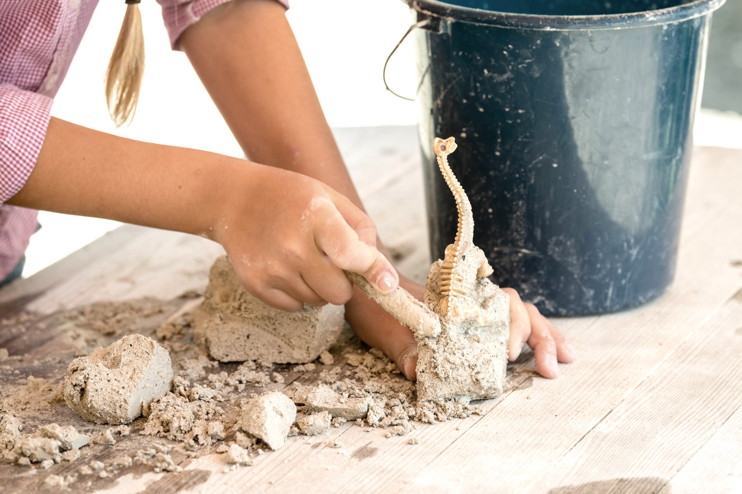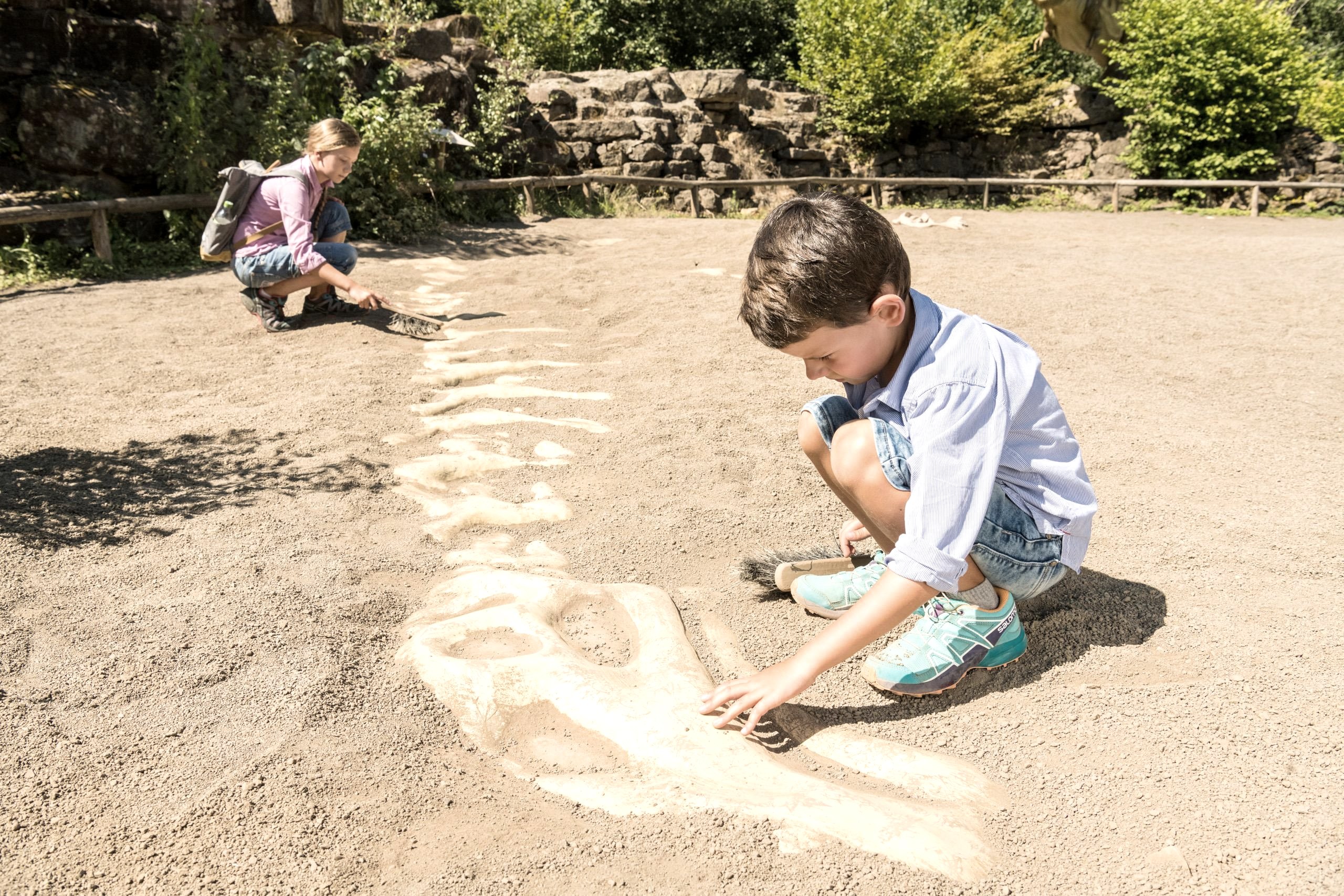 The "Explorer Camp", the hands-on area in the centre of the park, invites visitors to try things out and explore. The scientific preparation workshop for fossils, the "PaleoLab", is also located here. In the preparation laboratory, visitors learn how to make stones talk: Original finds of extinct species are processed here for palaeontological research, exhibitions and collections. Guided tours and workshops give interested parties an authentic insight into current research. In the research camp, children can uncover small dinosaur skeletons or real fossils, open fascinating crystal geodes with a little manual dexterity and care, remove shiny pyrite cubes from the rock and split open fossil slabs that may reveal a fossilised fish - activities that also fascinate adults.