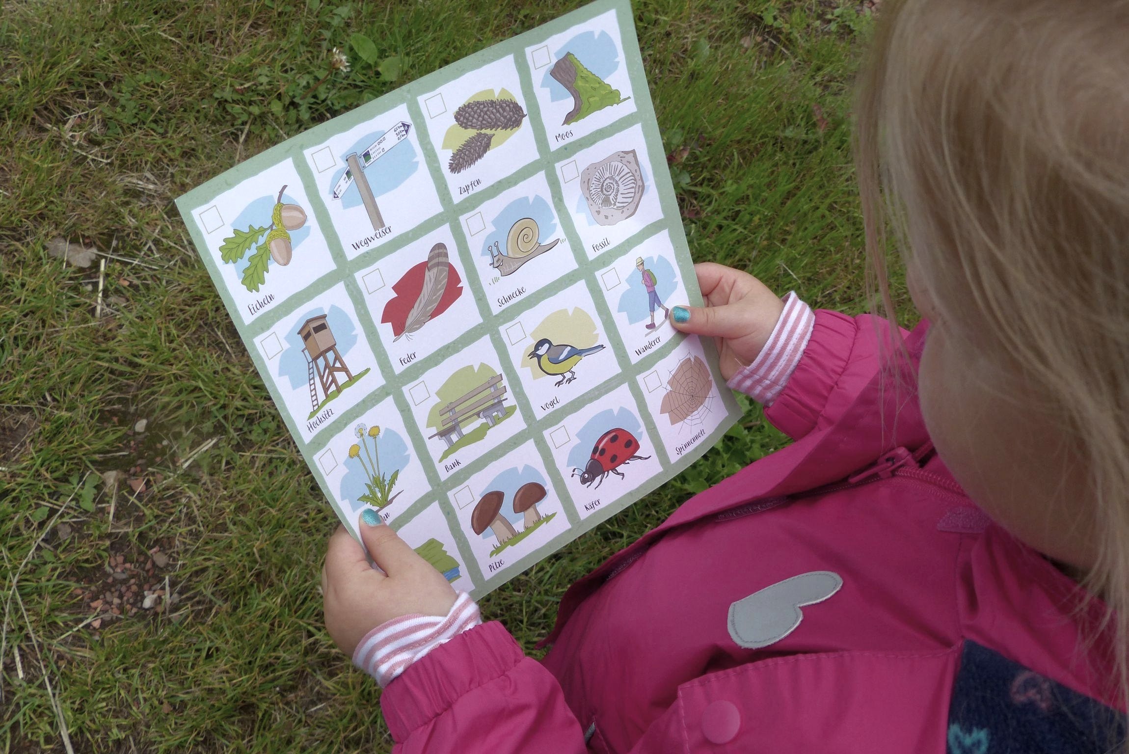 Hiking doesn't have to be boring for children. You can discover nature in a playful way through forests and fields. Who can find four of the things they are looking for first that form a line diagonally, vertically or horizontally and win the game? Stream, bank, snail, moss - bingo! The game is a nice change for the next family hike, the children's birthday party or the day of hiking with the school class.