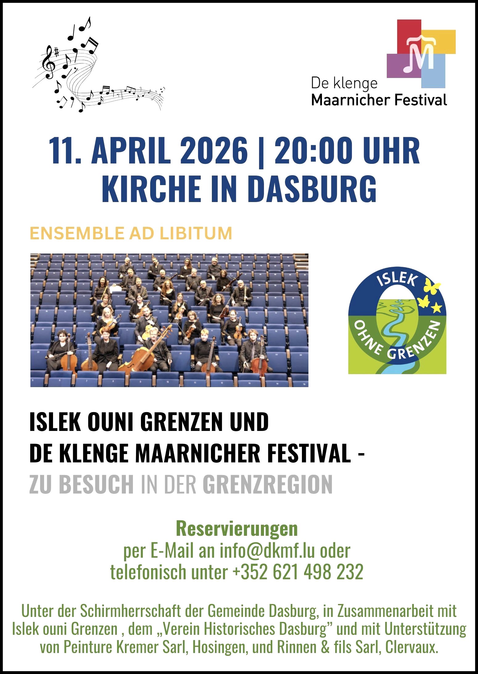 Under the patronage of the municipality of Dasburg, in cooperation with Islek ouni Grenzen, the "Historical Dasburg Association" and with support from Peinture Kremer Sarl, Hosingen, and Rinnen & fils Sarl, Clervaux.