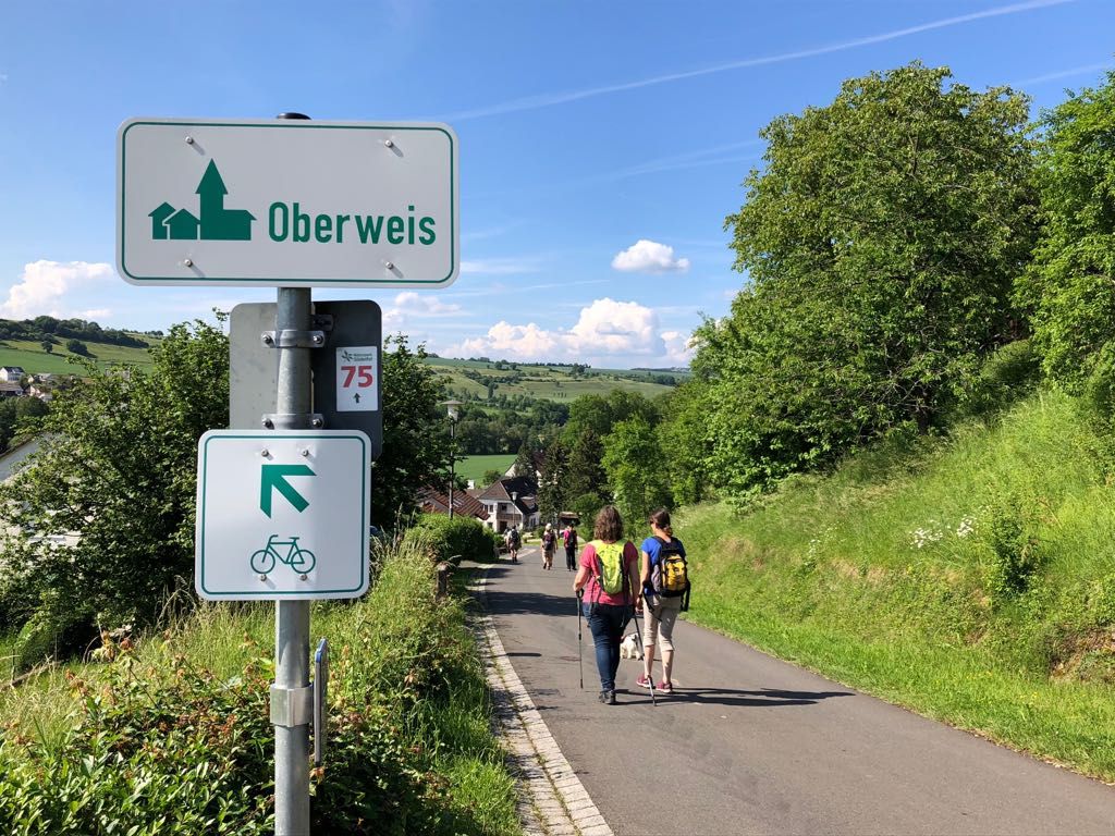 Wir starten mit unserer Wanderung am Parkplatz des Prümtal-Camping Oberweis (In der Klaus). Von dort biegen wir, nach wenigen Schritten, links in die Bitburger Straße ein. Eine Übersichtstafel liefert Informationen zu unserer Route Nr. 75 und weiteren Wanderwegen. Bevor es zum Rundwanderweg geht, sehen wir uns einen Teil des Oberweiser Kreuze-Weges an, der an der Kirchentreppe beginnt. In der Gemeinde befinden sich gut erhaltende Wegekreuze, die mit nummerierten Infotafeln versehen sind. Insgesamt zwölf Kreuze, aus dem 15., 16., 17. und 18. Jahrhundert zieren die Wege. Nach diesem kurzen Exkurs machen wir uns auf zur Route Nr. 75. Wir biegen an der Bäckerei links in die Bettinger Straße ein. Dort überqueren wir die Straße und gelangen über ein paar Stufen auf einen steilen Waldweg. Hier und da lassen die Bäume einen schönen Blick ins Tal zu. Oben angekommen geht es links weiter entlang eines großzügigen Weges, der im Frühling von farbenfrohen Orchideen gesäumt ist. Ruhende Moospolster, Spuren von Rehen auf dem Boden und das beruhigende Plätschern verschiedener Bäche begleiten unseren Weg. Einige Schritte nach dem Altbettinger Bach werden wir mit einem Panoramablick belohnt, bevor wir den Ort Bettingen erreichen. Jetzt heißt es noch einmal die „Füße unter dem Arm nehmen“, um die recht steile Straße nach oben zu gelangen, die durch ein schönes Wohngebiet führt. Die Anstrengung hat sich gelohnt, denn erneut können wir einen Panoramablick ins Tal genießen. Wir setzen unsere Tour durch die Bergstraße fort und gelangen zur Burgruine Bettingen. Hier gönnen wir uns eine kleine Brotzeit. Auf einem Teil der Burg erreicht man über ein paar Stufen eine Aussichtsplattform, von dieser gute Fernblicke möglich sind. Wir setzen unseren Weg ins Tal fort und flanieren entlang der Prüm, vorbei an Feldern und erblicken im Dickicht die Wüstung Altbettingen, die unter Denkmalschutz steht. Wegen der Einsturzgefahr darf sie allerdings nicht betreten werden. Wir verlassen die freien Hochflächen und erreichen ein Waldstück, in dem ein Bachlauf seinen Weg durch große, rote Felsformationen, hinab in die Tiefe, bahnt. Die Route führt uns oberhalb des Prümtal-Camping und gibt uns noch einen letzten Panoramablick mit auf den Heimweg.