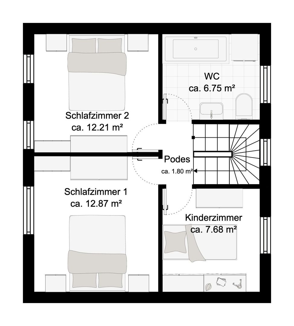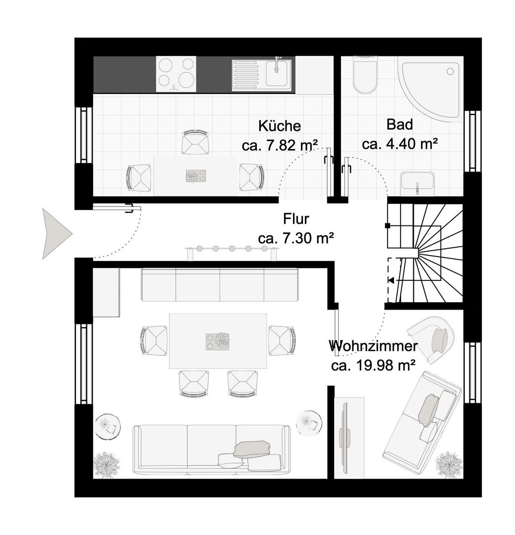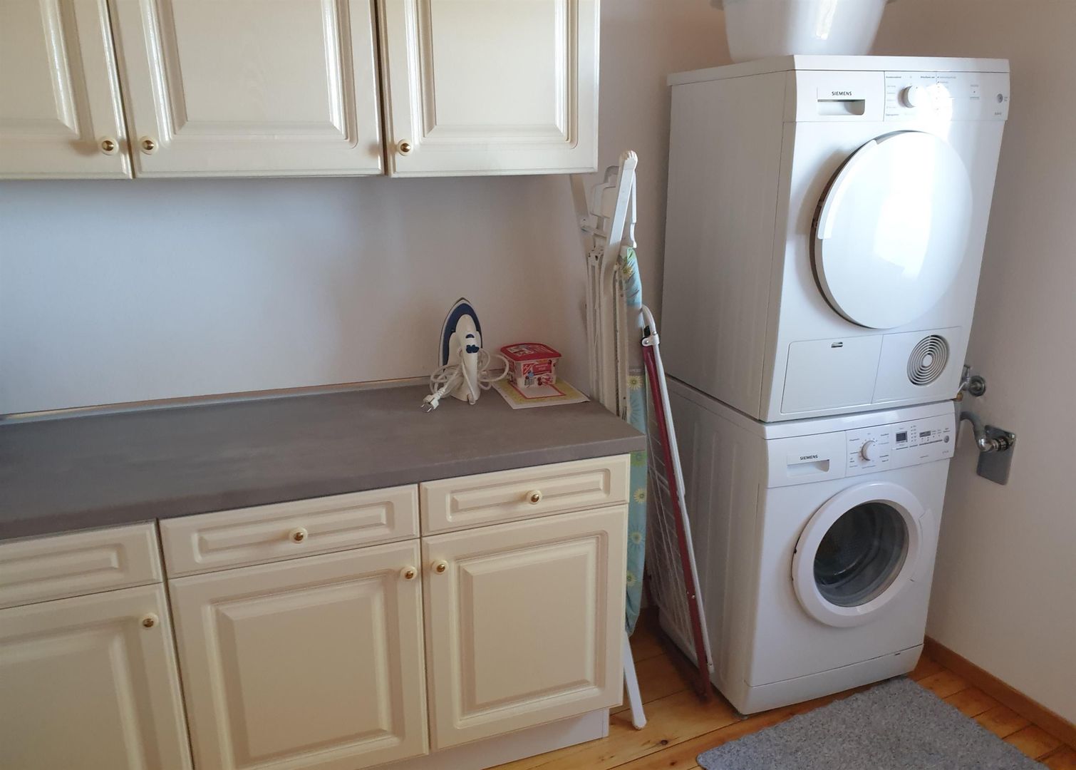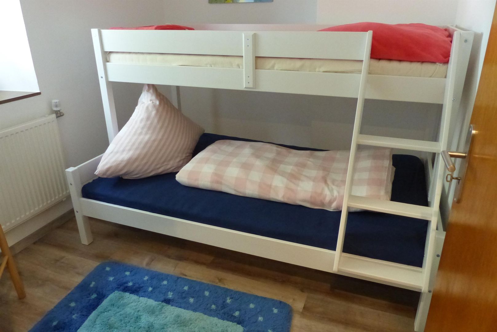 Sur deux étages se trouvent au rez-de-chaussée la cuisine avec coin repas, un salon/salle à manger et la salle de bain. Au premier étage se trouvent les trois chambres à coucher, dont une avec des lits superposés et deux avec un lit double, ainsi qu'une pièce avec WC et lavabo supplémentaires, sèche-linge et machine à laver.