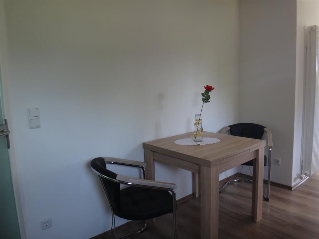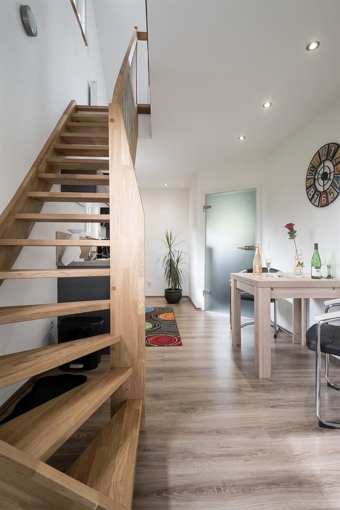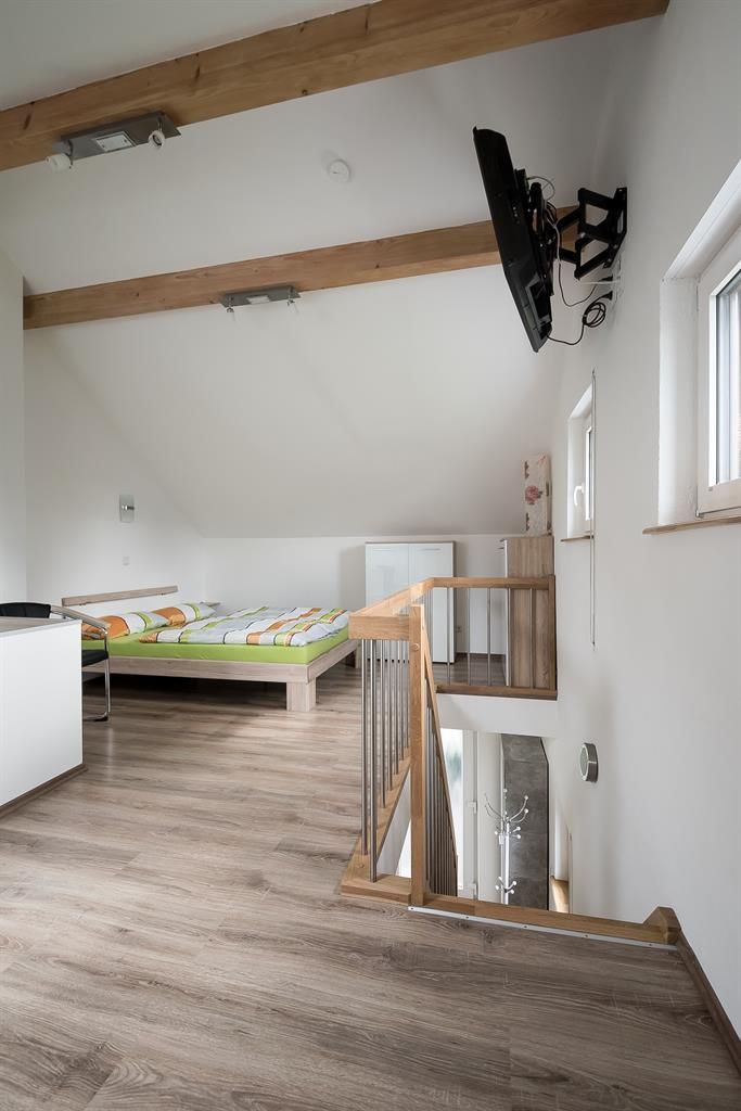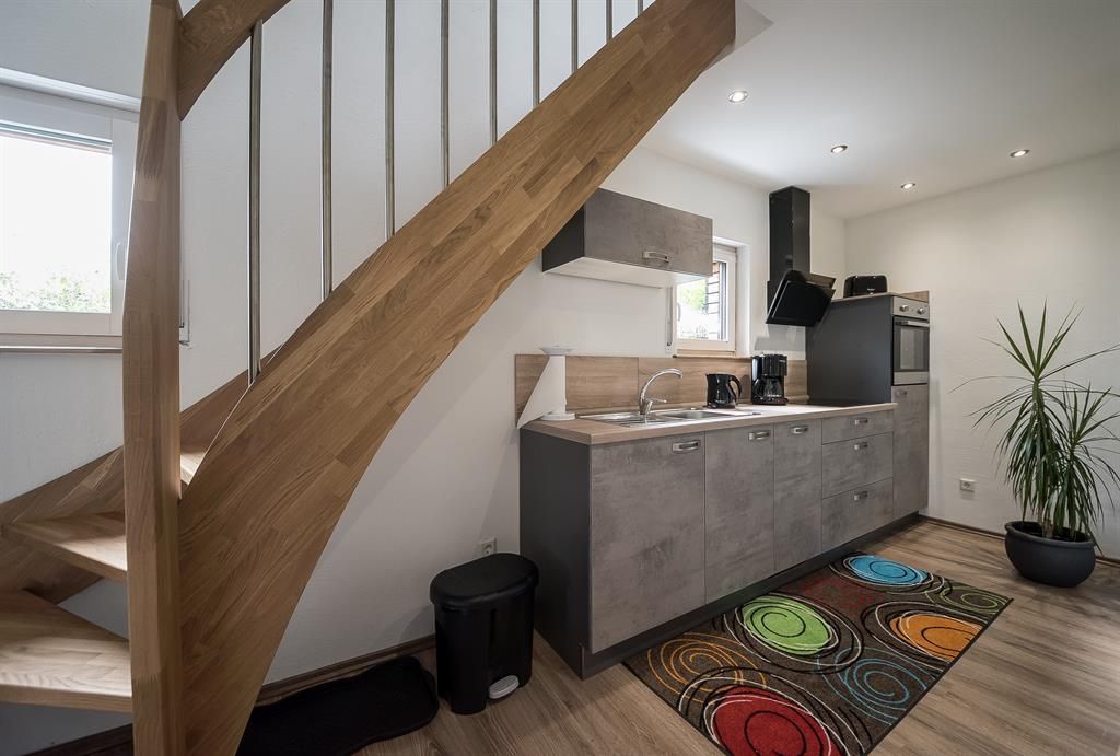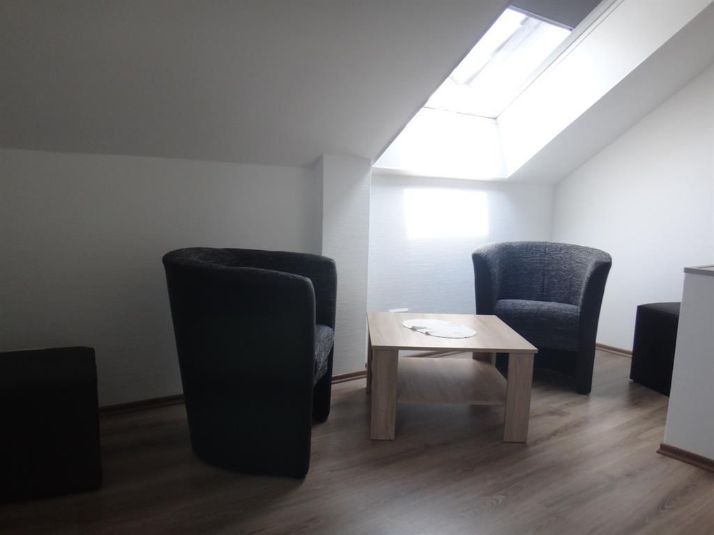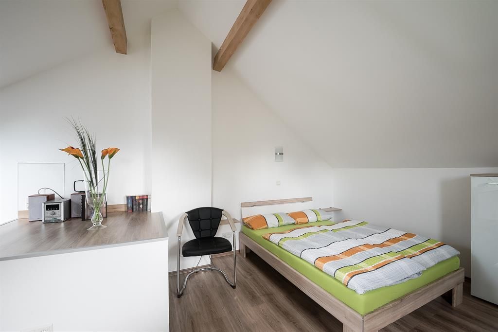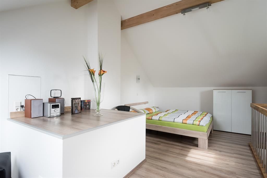 Studio combinée sur 2 étages avec une cuisine équipée qui offre une possibilité de s'asseoir; d'autant plus on y trouve une douche avec WC au rez-de-chaussée et au premier étage la chambre à coucher avec un lit français, 2 fauteuils, un tabouret et une table ainsi qu'une télévision.