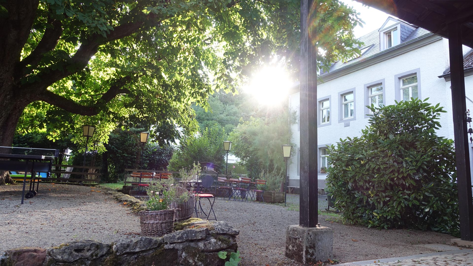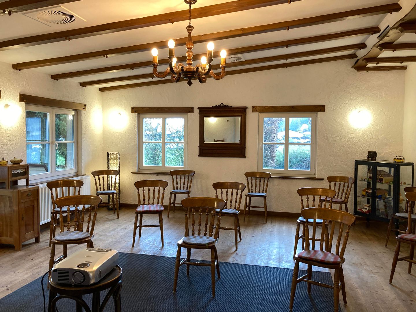 Notre salle de séminaire peut être louée pour des cours, des ateliers et des événements. La salle, baignée de lumière, donne sur la véranda de notre jardin arrière. On a vue sur notre vieux noyer, notre cochon Jacky et nos poules, il n'y a pas plus de distraction ici. Notre mini-cochon, la chatte Erna et les poules se réjouissent de votre visite.