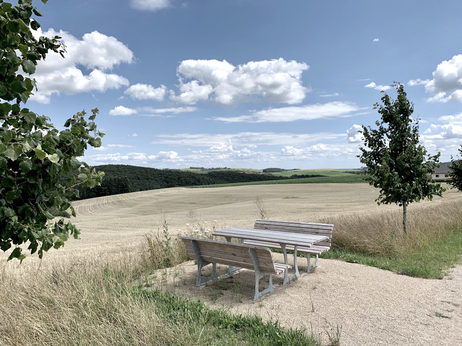 Der Weg führt an vielen Wiesen und Feldern vorbei.