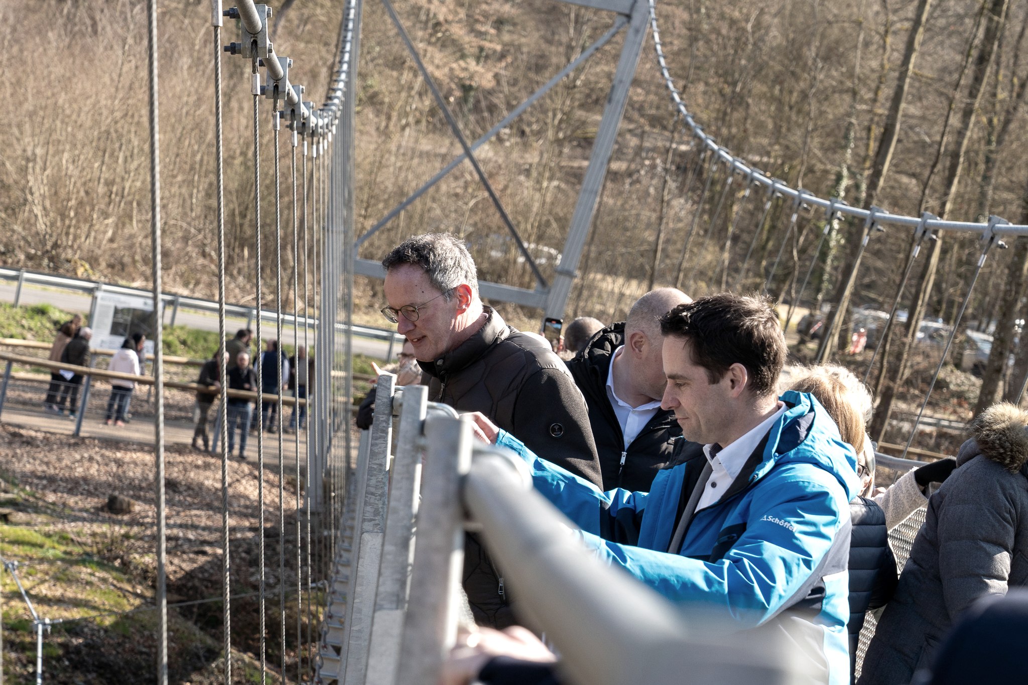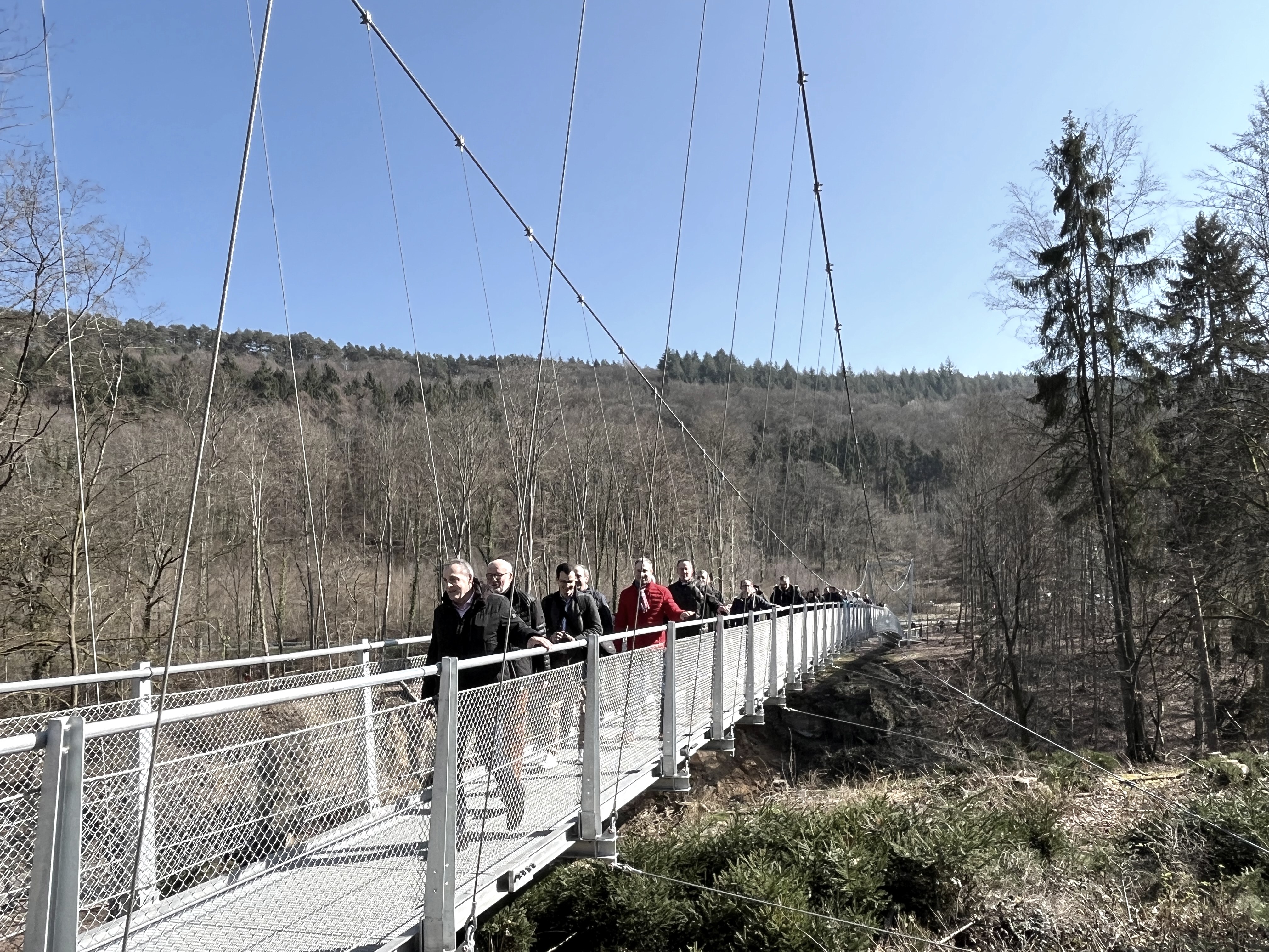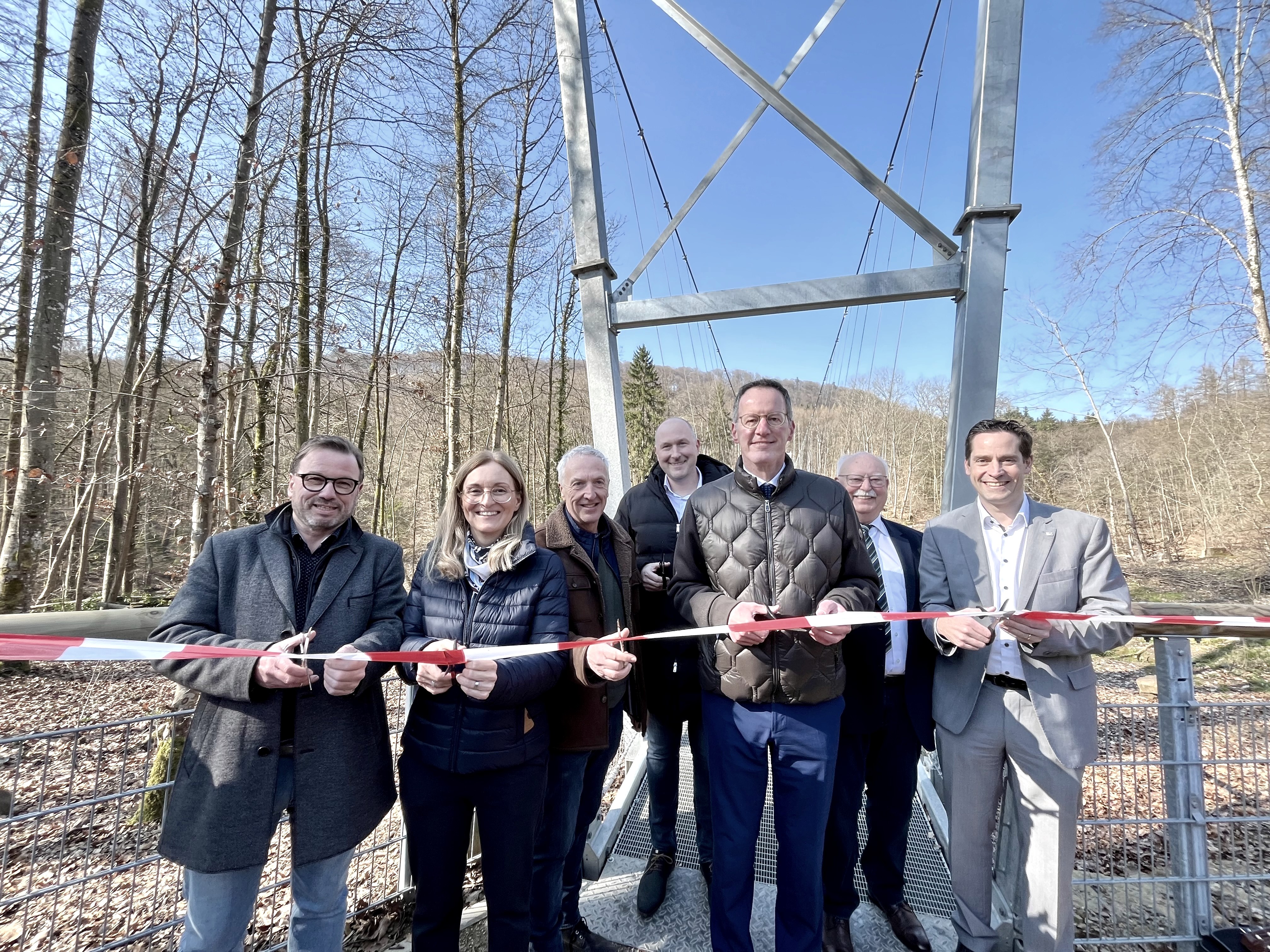 Das rheinland-pfälzische Innenministerium hat für die notwendigen Voruntersuchungen, Planungen, die Zuwegung und den Bau der Hängebrücke eine Förderung in Höhe von 1.150.000 Euro aus dem Sondervermögen „Aufbauhilfe 2021“ bereitgestellt. „Ohne diese 100 Prozent Förderung des Landes Rheinland-Pfalz hätte keine neue Brücke gebaut werden können“, betonte Landrat Andreas Kruppert in seinem Grußwort. „Dass die Hängebrücke dann so schnell gebaut werden und damit ein wichtiges Stück touristischer Infrastruktur wiederhergestellt werden konnte, verdanken wir der großzügigen Förderung des Landes. Alle haben bei diesem Projekt an einem Strang gezogen. Ein großes Dankeschön für die Koordination geht an die Geschäftsführerin des Zweckverbands Naturpark Südeifel, Daniela Torgau, Christian Wagner vom Bauamt der Verbandsgemeindeverwaltung Südeifel und an die Firma Crestageo aus der Schweiz, die die Brücke montiert hat. Die Zahlen zeigen, dass die Hängebrücke beliebt ist, denn seit der Öffnung Ende September 2023 wurden bis Ende Februar 2024 knapp 85.000 Zählungen registriert.“