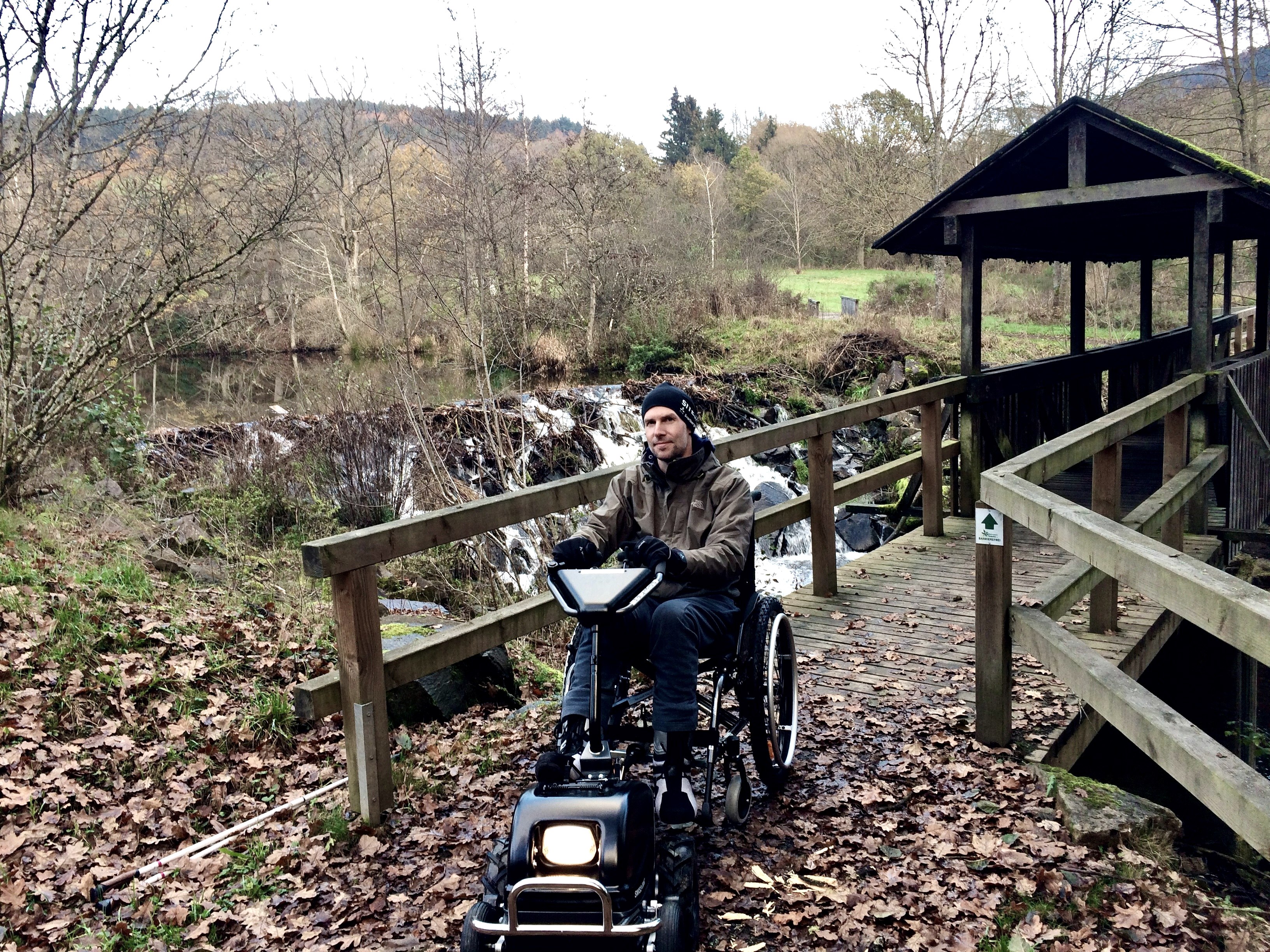Bei einem Gleitschirm-Absturz zog ich mir eine beidseitige Unterschenkelfraktur zu. Acht Wochen keinerlei Belastung auf die Beine ist die therapeutische Ansage. Eine lange Durststrecke für mich, da ich sonst täglich Sport in der Natur mache. Durch die Zusammenarbeit mit meiner Kollegin Indra Schapperdoth, Fachkraft für barrierefreien Tourismus beim Naturpark, wusste ich von den Rollstuhl-Zuggeräten. Die Aussicht, ein solches Gerät zu testen, war sozusagen die Beleuchtung des Tunnels, an dessen Ende das Licht ist.