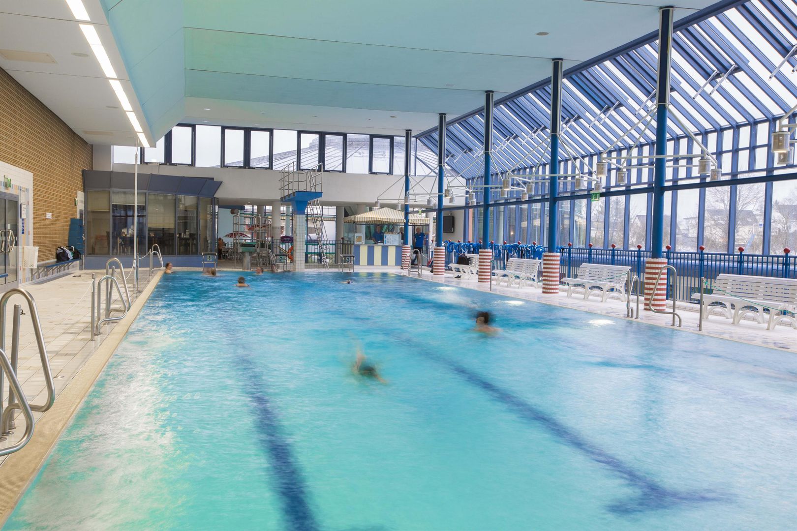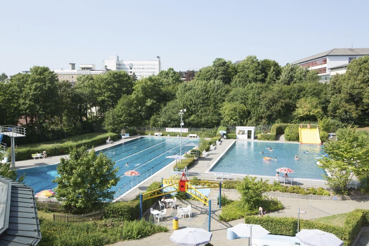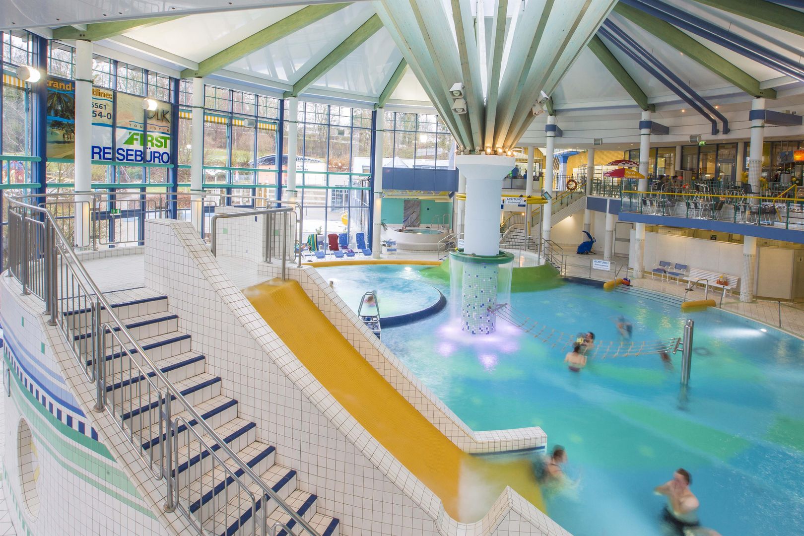 Ongeacht winter of zomer, in het recreatiebad CASCADE met SAUNAWERELD spelen de weersomstandigheden en het jaargetijde geen enkele rol. Hier kunt U gedurende het hele jaar naar keuze volledig ontspannen, of een dag vol actie en plezier beleven. Spanning & actie in het recreatiebassin met stromingskanaal, watervallen en waterkanonnen, brede stijle glijbaan, klimnetten en enorme zwembanden. De 55 m lange "Black-Hole-Slide" (pijp)-glijbaan is een absoluut plezier. Recreatie & plezier in het peuterbad, een vermakelijke waterspeelplaats met glijbanen, fonteinen en allerlei speelgoed. Rust & ontpanning vindt U in het warme bruisbad en in het bassin met weldadige massagesproeiers. Activiteit & fitnessin het 25 m lange sportbassin met 3- en 1 m hoge springtoren, in het 6-baans openlucht-sportbassin met 1-, 3-, und 5 m springtoren. In de openlucht-sector bevindt zich bovendien een ondiep bassin met 4 m brede glijbaan en een groot recreatiebad. Een zandbak en tafeltennis ronden de zwembadbelevenis af. Cursussen watergymnastiek en wateraerobic houden de bezoekers fit.