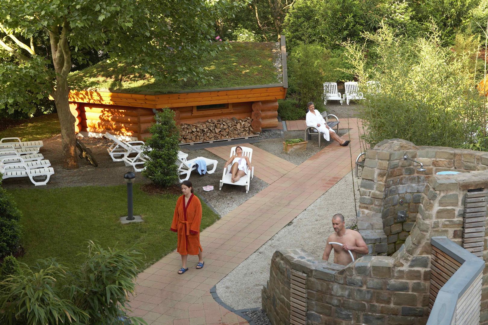 Gezondheit & welbehagen beleeft U in de 4-sterren saunawereld met 2 Romeinse sauna´s, een Turks-Osmaans stoombad en 3 Finse sauna´s met verschillende temperaturen (75°C, 85°C edelsteensauna, 95°C). De tuin met aardsauna (110°-120°C) en vuursauna (100°C) voldoen aan de hoogste eisen. Voor de afkoelings- en rustphases staan de saunabezoekers douches met diverse geurstoffen, koudwaterbassins in de in- en outdoor-sector en tevens warmwaterbad en relaxzone ter beschikking. Bovendien bestaat de mogelijkheid van het veelvoudige massage-aanbod of een bezoek aan het solarium te genieten.