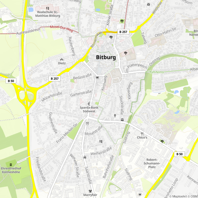 gymnasium". Het stadscentrum, het stadhuis en het VVV-kantoor liggen op