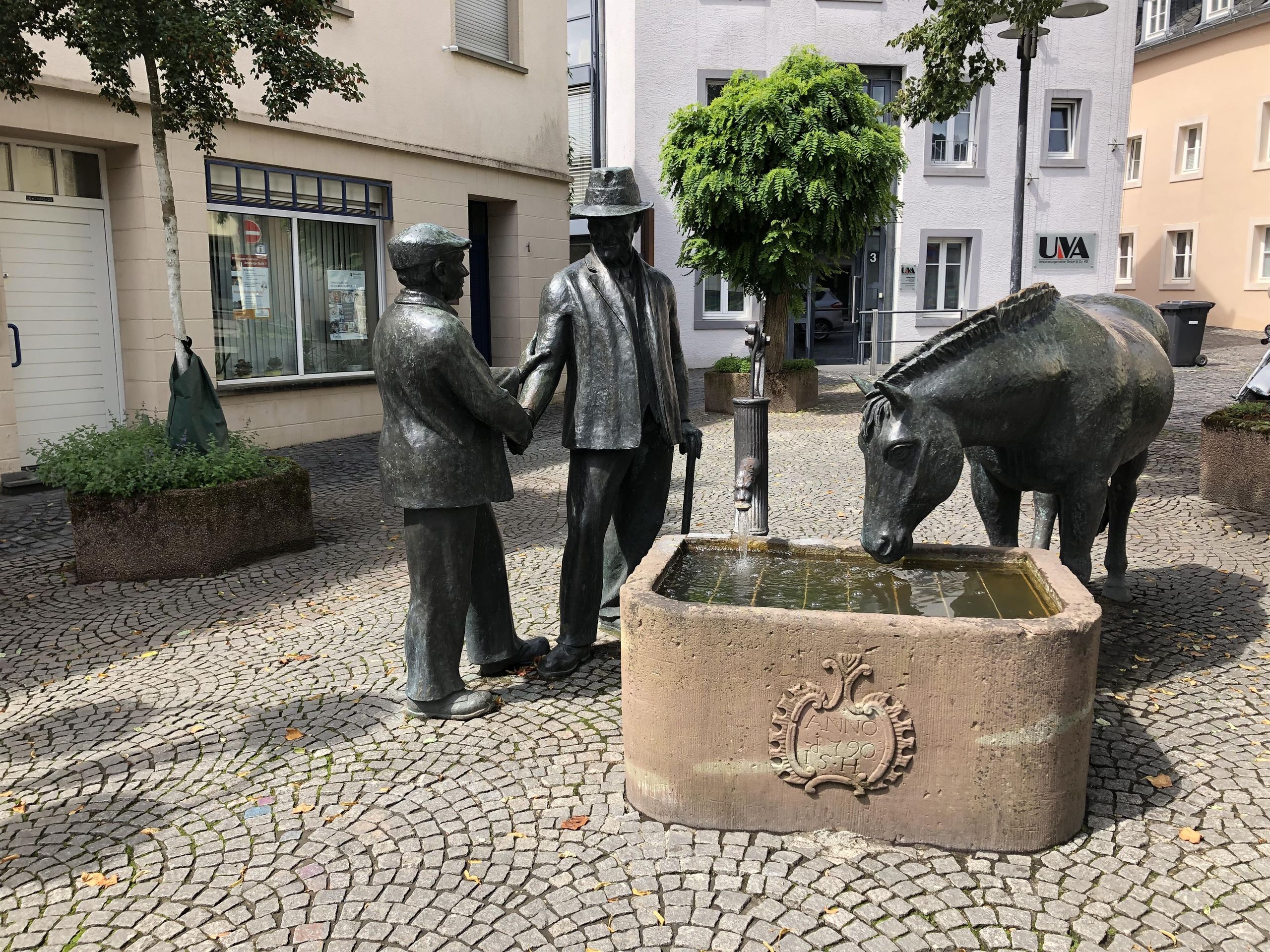 Die 1992 eingeweihte Bronzeplastik des Bitburger Bildhauers Roger Delleré stellt das Thema Pferdehandel dar. Sie erinnert an Zeiten, als regelmäßig abgehaltene Pferde- und Viehmärkte noch zum alltäglichen Geschehen in Bitburg zählten. Diese Märkte leisteten einen wichtigen Beitrag zum Aufschwung der Stadt. Das Kunstwerk zeigt zwei Bitburger „Originale“, Schillings Klaus und Jäschkes Fritz, die einen Pferdekauf per Handschlag besiegeln.