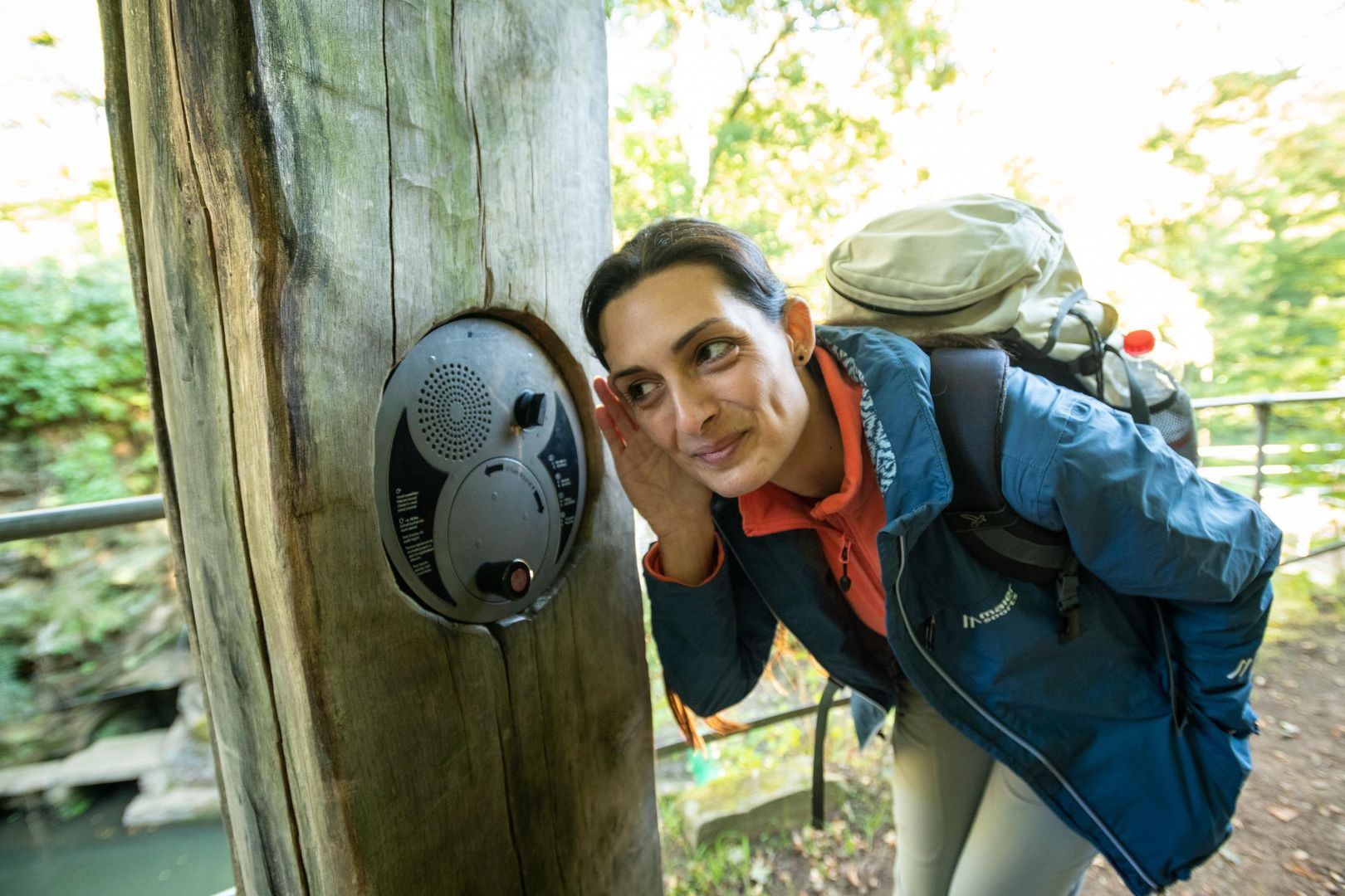 Die "Lauschkurbel": Oberhalb des Weihers auf einer kleinen Plattform kann man eine ungewöhnliche "Lauschstation" ausprobieren: Wer an der Kurbel dreht, die in den Holzstamm eingelassen ist, erfährt Interessantes und Spannendes über die Geschichte und die Besonderheiten des Felsenweihers.