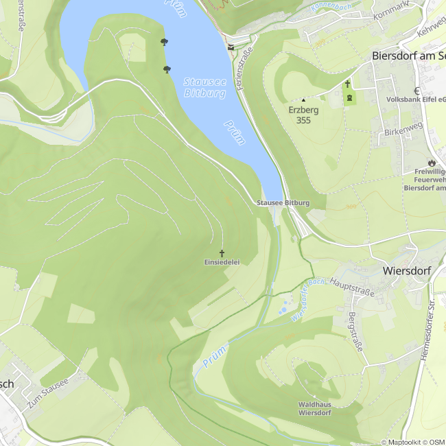 Der Sakralbau „Einsiedelei“, eine schmucke Kapelle in den Wäldern der Ortsgemeinde Wiersdorf, auf einem Wiesenhang westlich der Prüm ist über gut ausgebaute Wanderwege vom Ort aus bequem zu erreichen. Bei der Kapelle ist eine Lourdesgrotte aus dem Jahre 1923 und eine Mariensäule aus dem Jahr 1929/30 mit dazugehörigem Kreuzweg mit 14 Stationen zu finden. Hier hat von 1906 bis 1945 der fromme Einsiedler Jakob Leisen gelebt. Er baute einen Kreuzweg und eine kleine Kapelle im Wald. Wenn die Wiersdorfer ihn bei ihren Sonntagsausflügen besuchten, bewirtete er sie mit Schwarzbrot und selbstgemachtem Ziegenkäse. Heute kümmert sich der Förderverein „Die Einsiedler“ um das Vermächtnis des frommen Mannes.