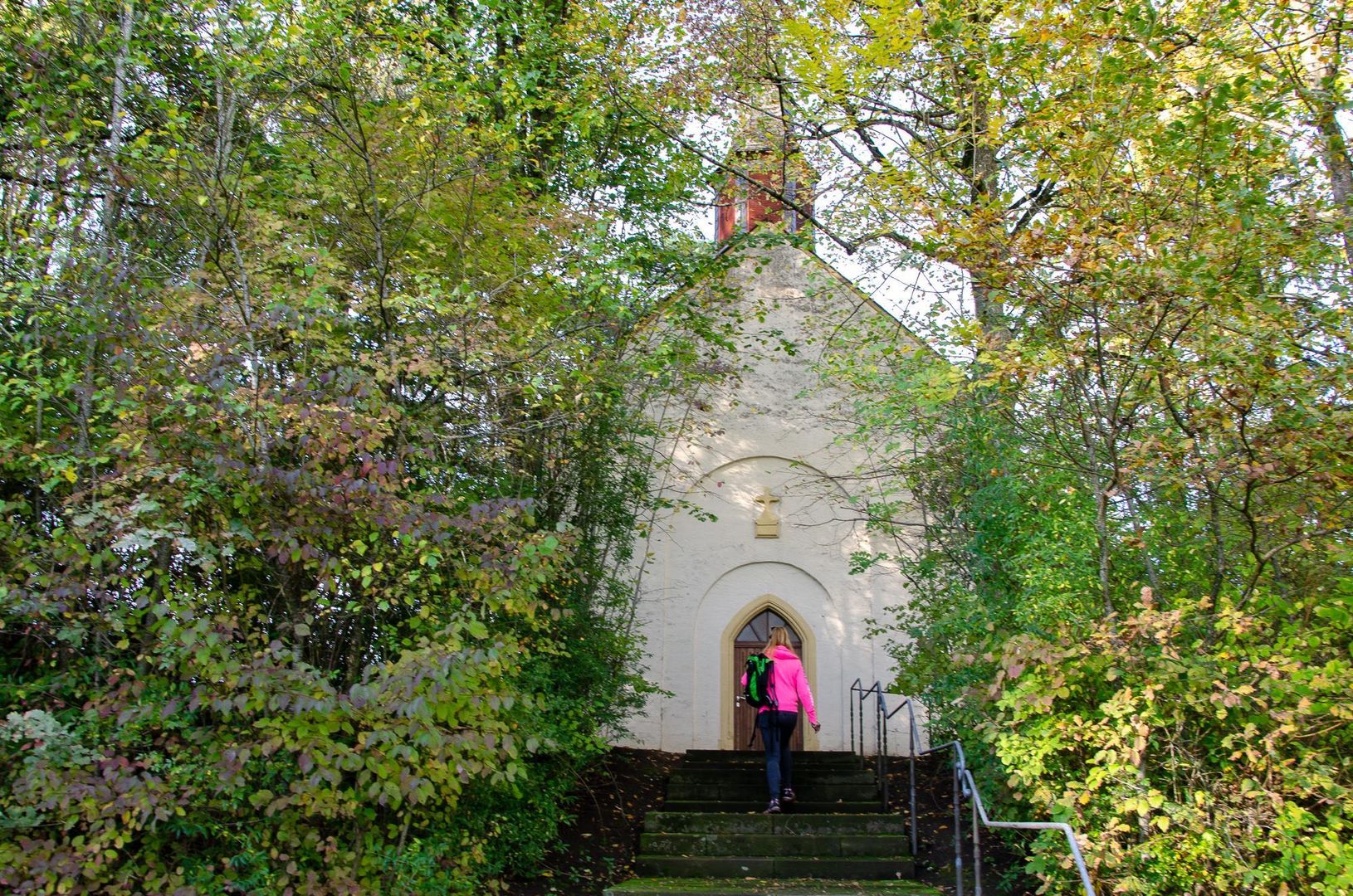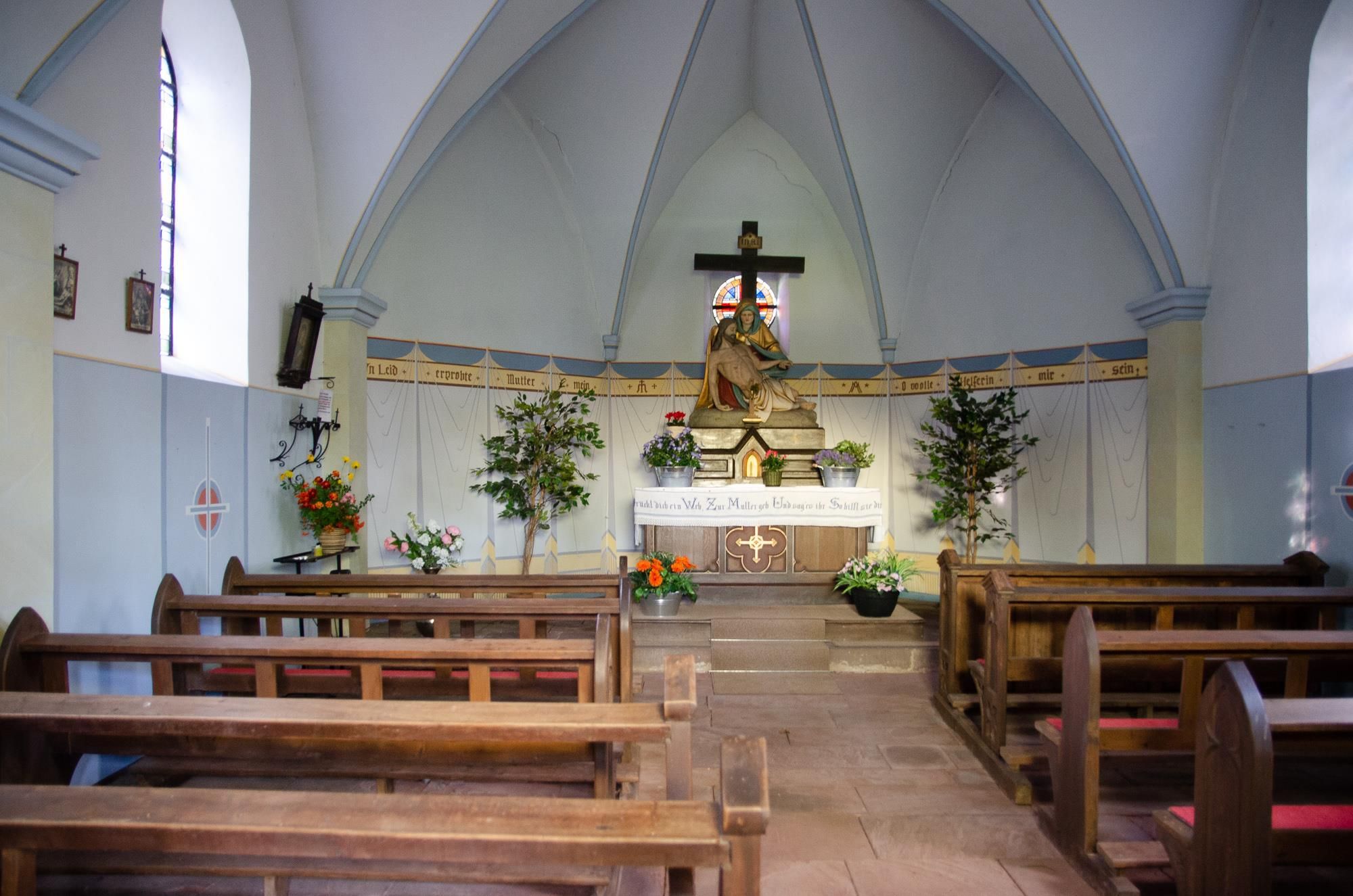 Der zweiachsige, dreiseitig schließende Saalbau wurde 1870 am Waldrand westlich oberhalb des Ortes errichtet (Quelle kulturdb.de).