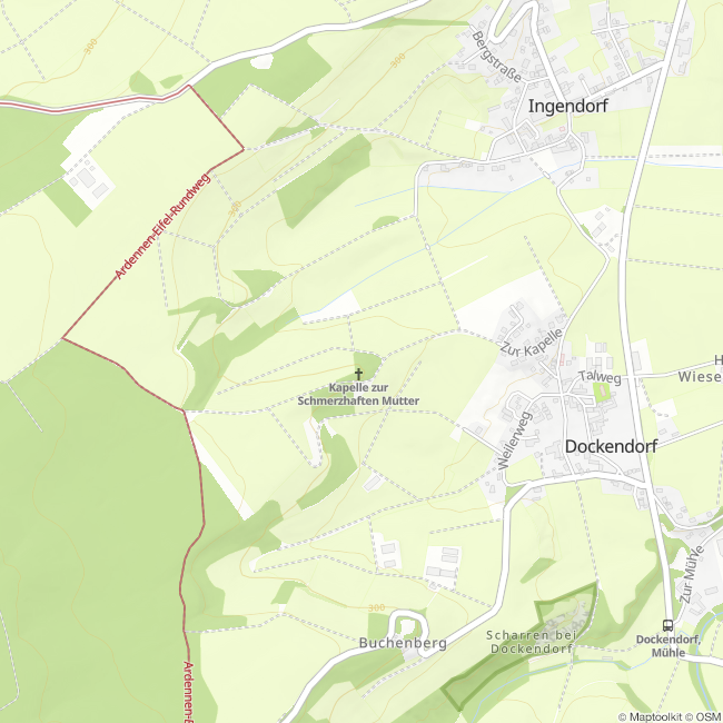 Am Rundwanderweg Nr. 89 des Natupark Südeifel liegt die Kapelle zur Schmerzhaften Gottesmutter (Gemeinde Dockendorf).