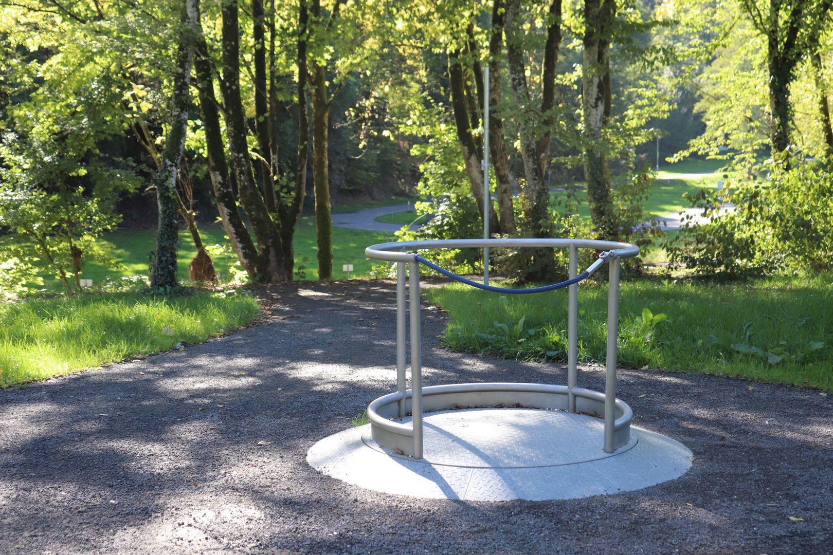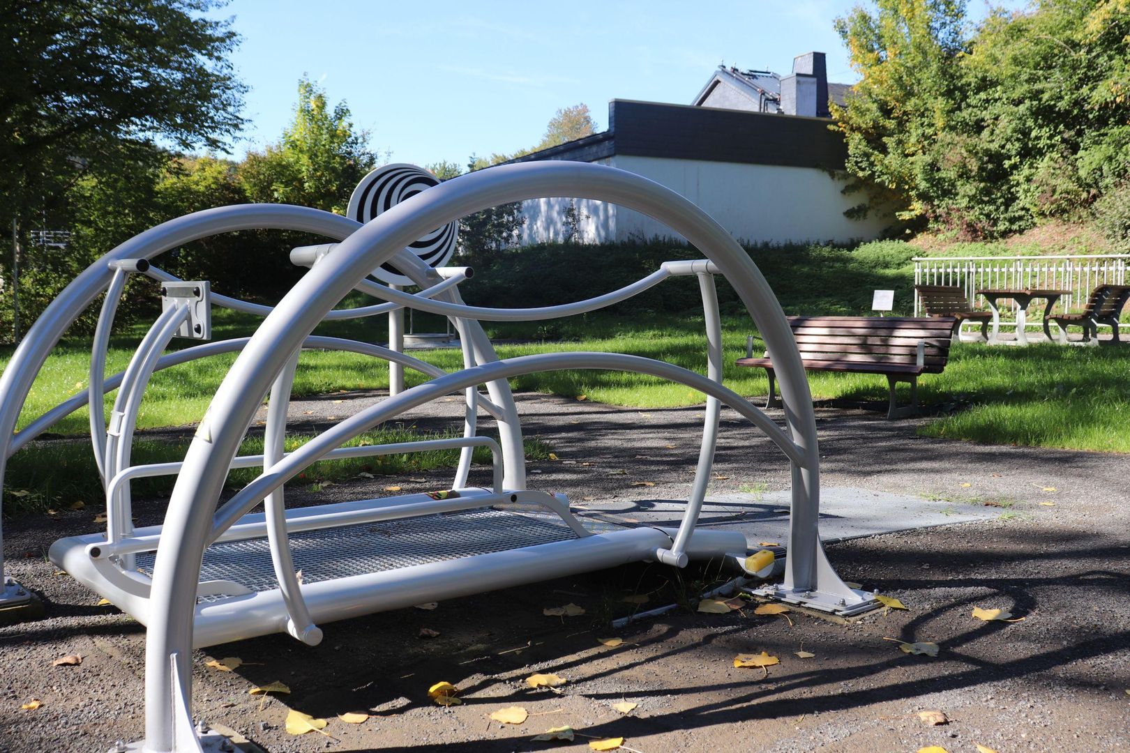 Mehrere Spielgeräte, wie z.B. ein Klangzaun, eine rotierende Scheibe, ein Kugellabyrinth und eine Schaukel für Rollstuhlfahrer sowie Sitzbänke laden zum Verweilen ein.