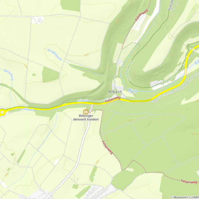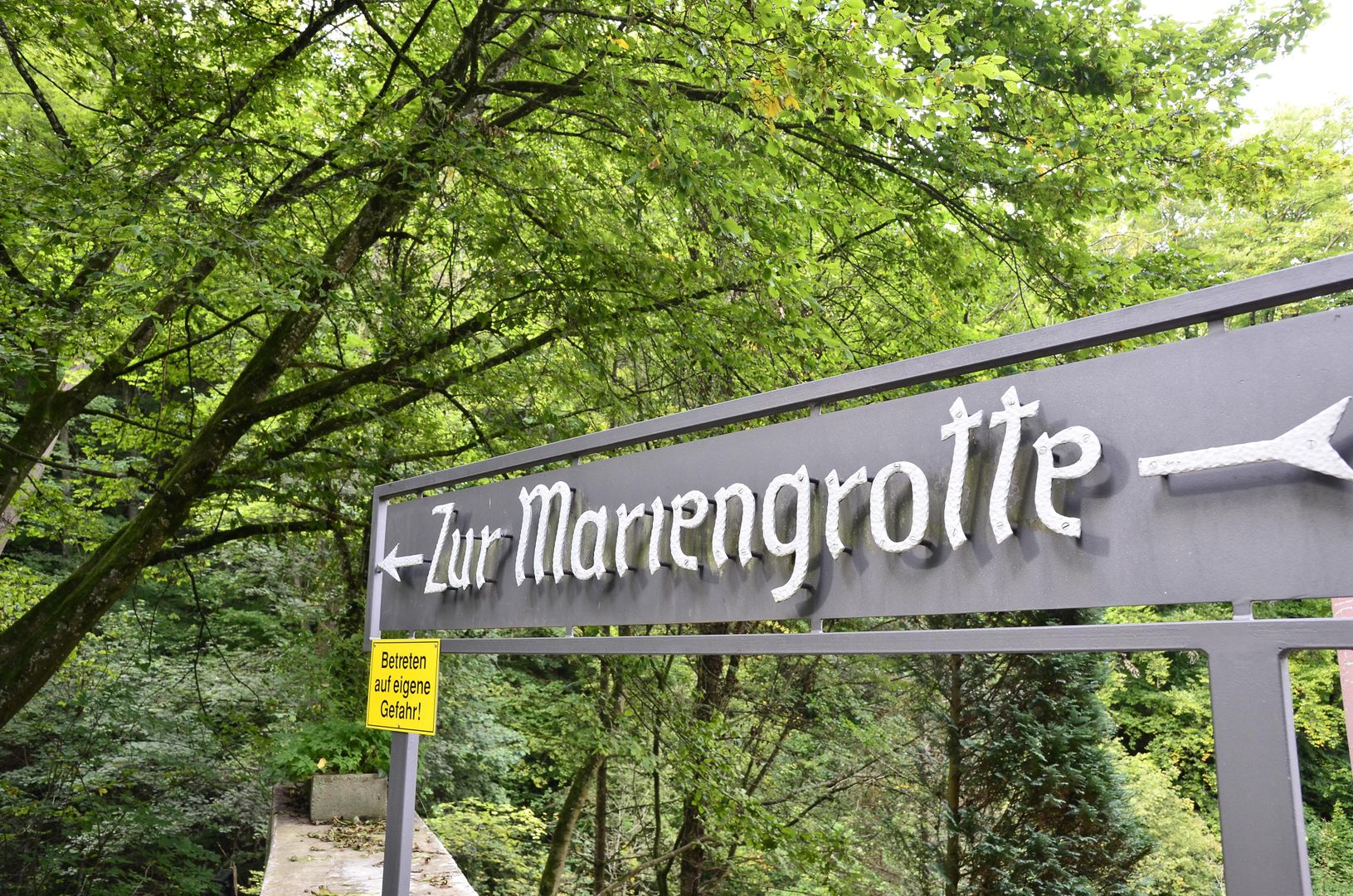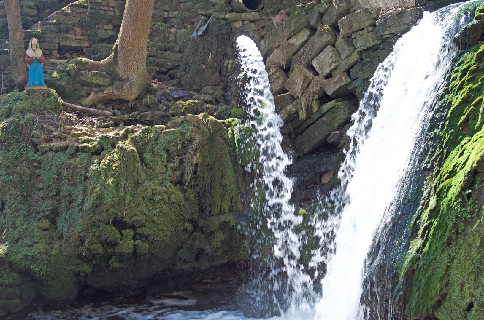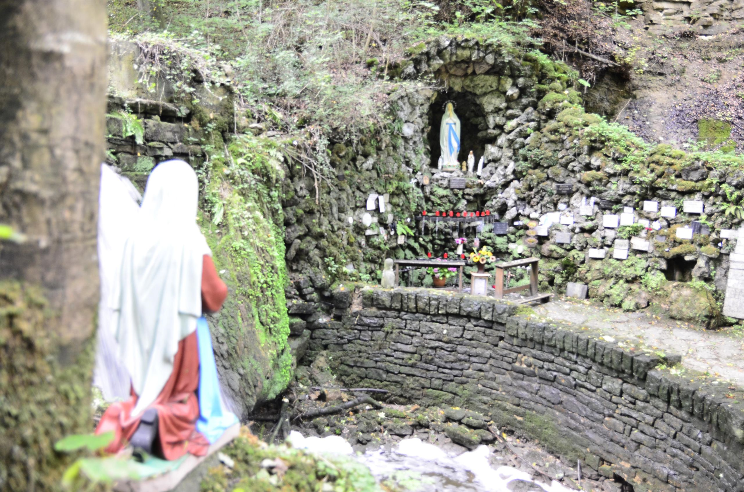 Östlich von Bitburg, ca. 3 km entfernt, liegt in einer idyllischen Kalkschlucht das Albachtal. Treppen aus Naturstein (Vorsicht Rutschgefahr) führen zu dem verwunschen Ort der Mariengrotte. Links und rechts säumen Moosflächen, Farne und Klee den Weg. Nach kurzer Zeit eröffnet sich der Blick auf einen Wasserfall und die Mariengrotte. Der Albach bildet mehrere kleine Wasserfälle bis er in das breitere Albachtal fließt. Der größte Wasserfall ist an der im Tal gelegenen Mariengrotte zu finden. Sie ist seit Generationen ein Ort der Marienverehrung und Ziel vieler Pilger. Die älteste Tafel stammt aus dem Jahre 1940. In der Grotte befindet sich eine kleine Wasserquelle, die von Besuchern als Weihwasser genutzt wird. An der Gedenkstätte sitzt zusätzlich eine kniende Maria auf der gegenüberliegenden Seite der dominierenden Marienstatue.