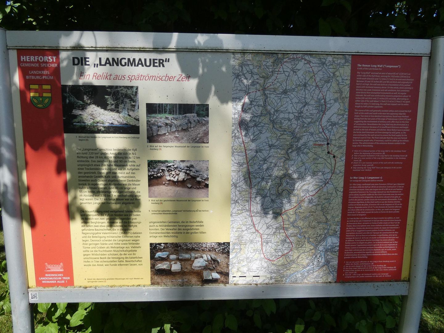 Während der römischen Herrschaft bildete sich in der Zeit um 350 n.Chr. die sog. Latifundienwirtschaft, das bedeutet die Bewirtschaftung eines „ausgedehnten Grundstückes“. Damals wurden u.a. Teile der heutigen Gemarkungen von Orenhofen, Speicher, Herforst und Spangdahlem, also der westlichen Teil der Verbandsgemeinde Speicher, zu einer solchen Latifundie zusammengefasst. Eine Mauer, die sog. „Langmauer“ umfasste ein Gebiet von etwa 220 km2 Grundfläche. Sie erstreckte sich beiderseits der unteren Kyll von Trier bis in die Höhe von Kyllburgweiler. Im Gemeindewald Herforst, dem sog. „Arenbergischen Forst“ sind noch Reste dieser Mauer als Steinwall mit Fundamenten im Original bis zu einer Höhe von 1 m erhalten. Nach heutigem Wissensstand betrug die Gesamtlänge dieses spätantiken, römischen Baudenkmals ca. 72 km; sie war 2–3 m hoch, 70–80 cm breit und mit halbrunden Steinen, den Halbwalzen, abgedeckt. Als Baumaterial wurde seinerzeit der heimische Sandstein benutzt. Am Ortseingang von Herforst kann ein Stück dieser Mauer als Rekonstruktion besichtigt werden. Ausführung, Lage und Richtung entsprechen dem Original. Mit einbezogen in die Nachbildung sind auch Kopien der bei den Befundgrabungen entdeckten PEDATURA-Steinen, auf denen spätrömische Inschriften zu lesen sind.